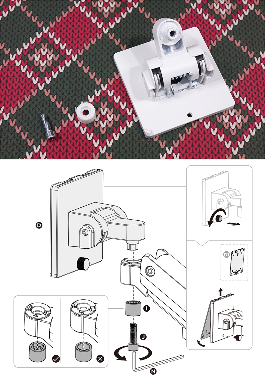 베사부까지 장착을 마쳤으며, 이제 베사부에서 분리해 둔 베사홀 어댑터를 모니터 후면에 제공되는 나사들과 와셔를 사용해 장착해 줍니다. 베사홀 어댑터까지 장착한 후에는 역순으로 베사부에 다시 장착해 주고, 후면 손나사로 고정을 해주면 모든 조립이 끝납니다. 조립에 큰 어려움은 없고, 조립 후 모니터 높낮이 조절을 위해서 자유롭게 하기 위해서는 상부암에 있는 높낮이조절 장력부를 사용자가 렌치를 사용해 원하는 대로 조절해야 합니다.