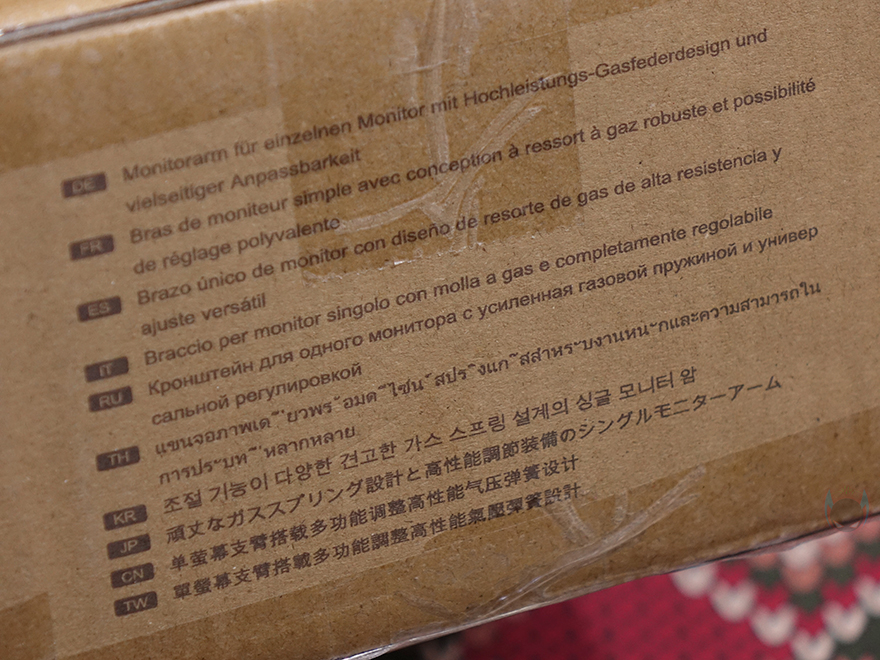 제품 박스부터 살펴보면, 박스 전면에는 왼쪽에 제품 이미지를 담고 있어서 모니터암 디자인을 간접적으로 먼저 확인이 됩니다. 그리고, 전면 오른쪽에는 모델명과 함께 주요 특징을 6가지 표기해놨는데, 17인치부터 최대 49인치까지 지원, 2kg부터 최대 20kg 지원, 베사홀 규격, 모니터 틸트, 스위블 조절 범위, 360˚ 피벗 지원을 언급하고 있죠. 박스 한쪽 측면에는 한국어를 포함해 다국적 언어로 제품 콘셉트 문구를 표기해 놨으며, 반대쪽 측면에는 방금 언급한 주요 특징 내용을 포함 제품의 기본 사양을 표기해 놨습니다.