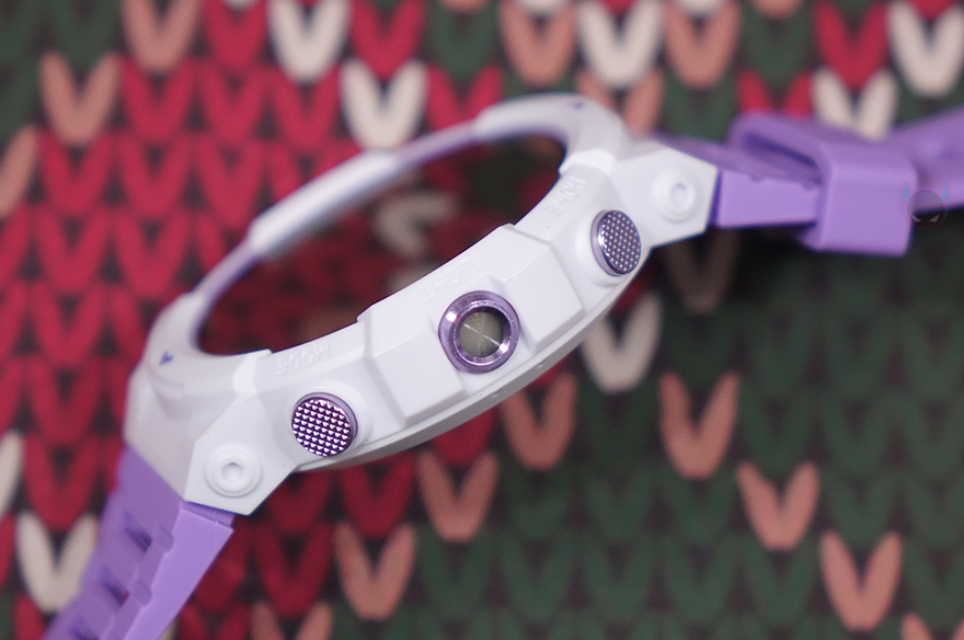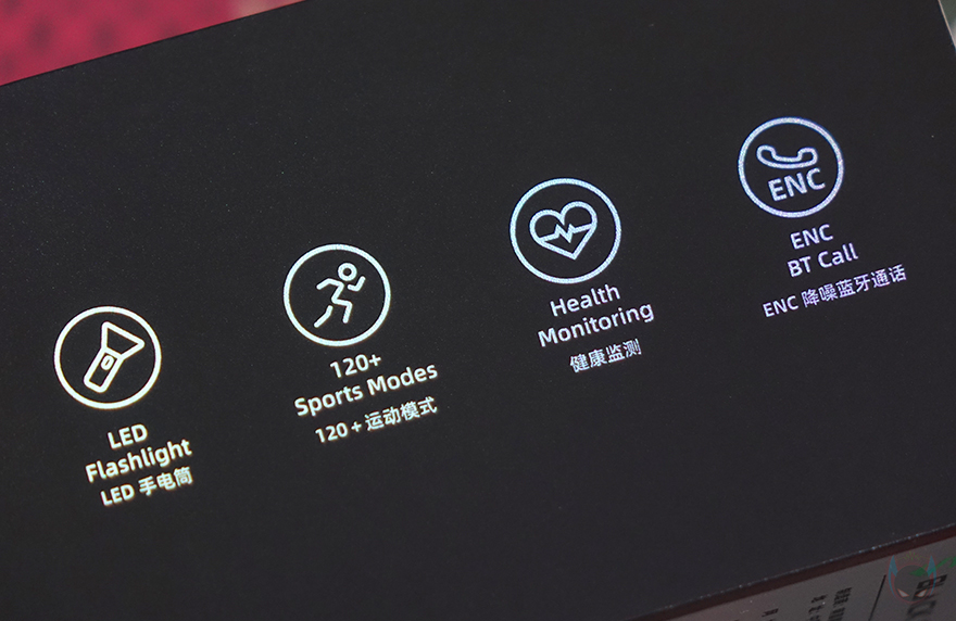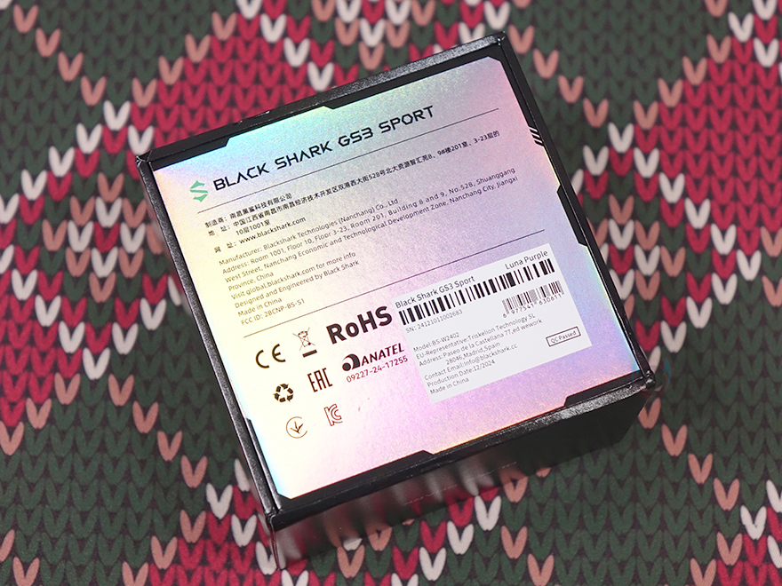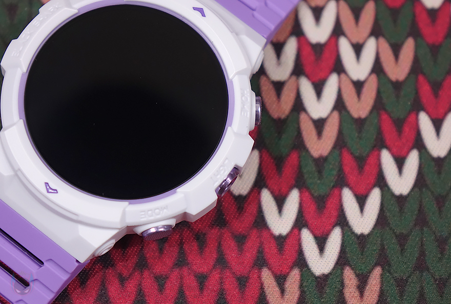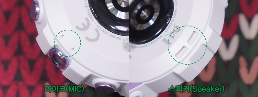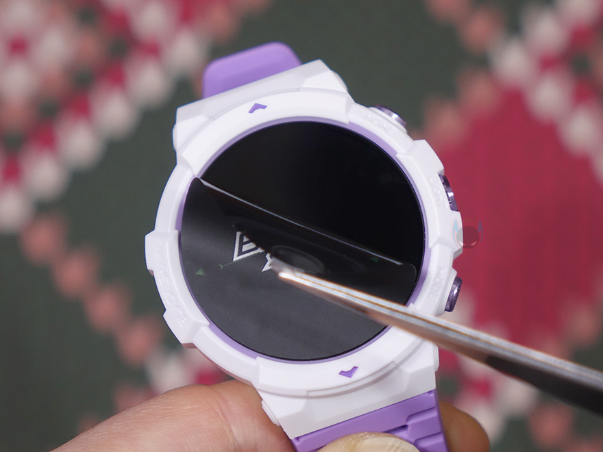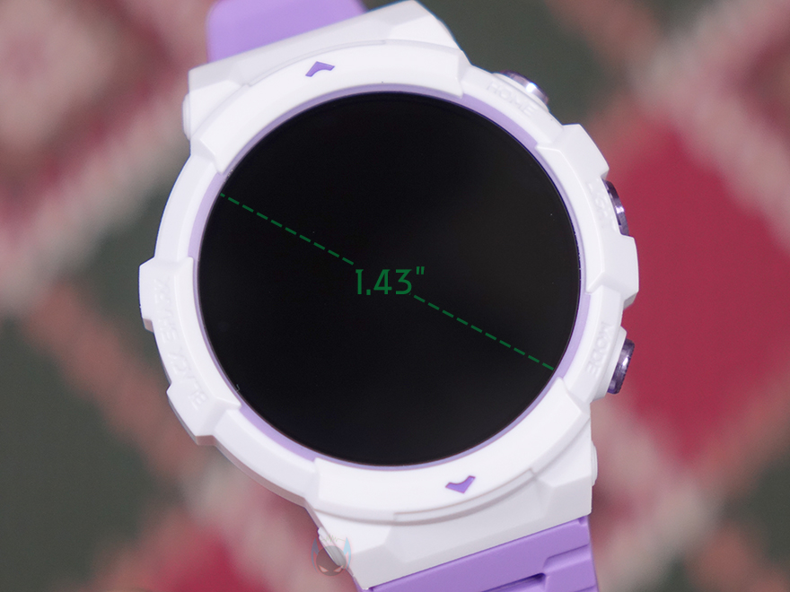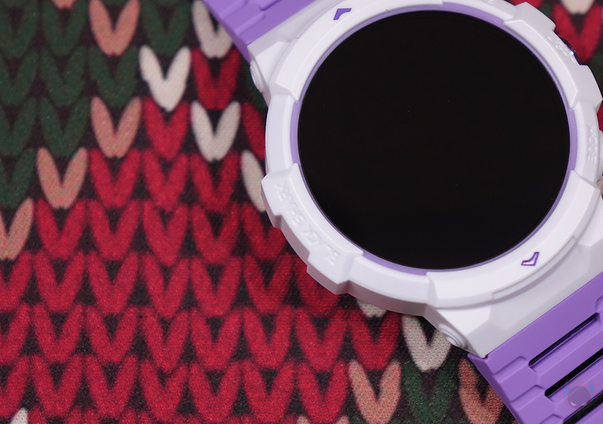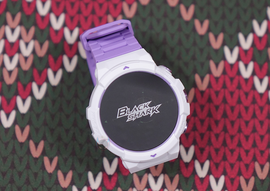 리뷰에선 루나 퍼플 색상 모델로 살펴볼 텐데, 먼저 디스플레이는 기존 GS3와 동일하게 1.43인치 AMOLED이며, 466x466 해상도에 326 PPI 픽셀밀도와 60Hz 주사율, 그리고 최대 600 니트 밝기를 갖추고 있습니다. 물론, 디스플레이를 감싸고 있는 즉 워치 케이스 디자인은 GS3와 완전히 다르고 전형적인 스포츠 시계 디자인 감성으로 적용했죠. 케이스 왼쪽에는 Black Shark 로고를 새겨놨으며, 오른쪽에는 측면 버튼과 LED 플래시라이트 위치에 맞춰 각각 표기를 해놨는데, 위에서부터 HOME/LIGHT/MODE순입니다. 버튼과 플래시 프레임 색상은 모두 퍼플이죠. 그리고, 디스플레이와 반대편인 후면에는 가운데 센서 부분에 개봉 시 역시 보호비닐이 부착되어 있으며, 센서를 중심으로 왼쪽에는 마이크(Mic), 오른쪽에는 스피커(Speaker)가 내장되어 있습니다. 앞서 주요 특징에서 언급했듯이 블루투스 전화통화 기능을 지원하고 있기 때문이죠.
