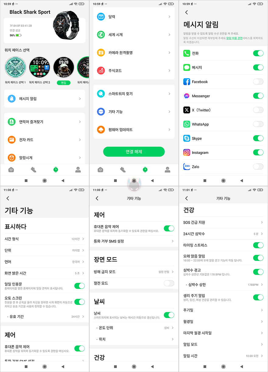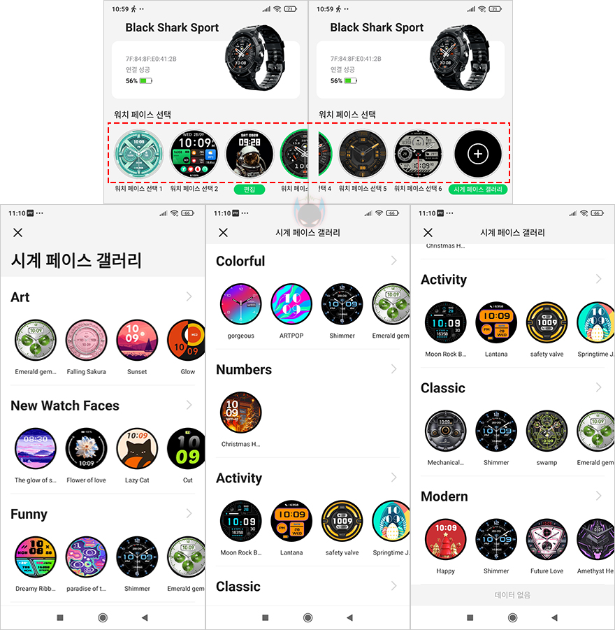 끝으로, Shark Fitlife 앱에서 장치 메뉴를 살펴보면, 연동된 GS3 SPORT 스마트워치의 배터리 잔량과 함께 워치 페이스, 메시지 알림, 연락처, 전자 카드, 알람시계, 달력, 세계 시계, 카메라 원격촬영, 주식코드, 스마트워치 찾기, 기타 기능, 펌웨어 업데이트 메뉴를 확인할 수 있습니다. 메시지 알림은 스마트폰으로 받는 메시지를 스마트워치에서 볼 수 있는 사용자가 사용하는 앱들을 선택하면 되는데, 스마트폰에 설치된 모든 앱을 보여주는 게 아니라 일반적으로 사용하는 메신저나 SNS 앱 목록을 보여주고 선택할 수 있습니다. 그리고, 기타 기능으로 들어가면 시간설정을 비롯해 방해 금지 모드 활성화, 날씨, SOS 긴급, 24시간 심박수, 스트레스, 여성 주기 등의 실시간 모니터링 설정을 할 수 있는데, 조금 아쉬운 점은 수면과 산소포화도 설정은 없습니다. 특히, 산소포화도 같은 경우에는 이번에도 수동으로 측정해야합니다. 마지막으로 워치페이스 같은경우 GS3 SPORT 스마트워치 기본 6개가 탑재되어 있고, 1개를 사용자가 시계 페이스 갤러리에서 선택해서 적용할 수 있죠. 시계 페이스 갤러리 들어가면 각 분류별 카테고리와 함께 총 200개 이상의 다양한 디자인을 제공해주고 있습니다.