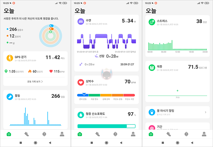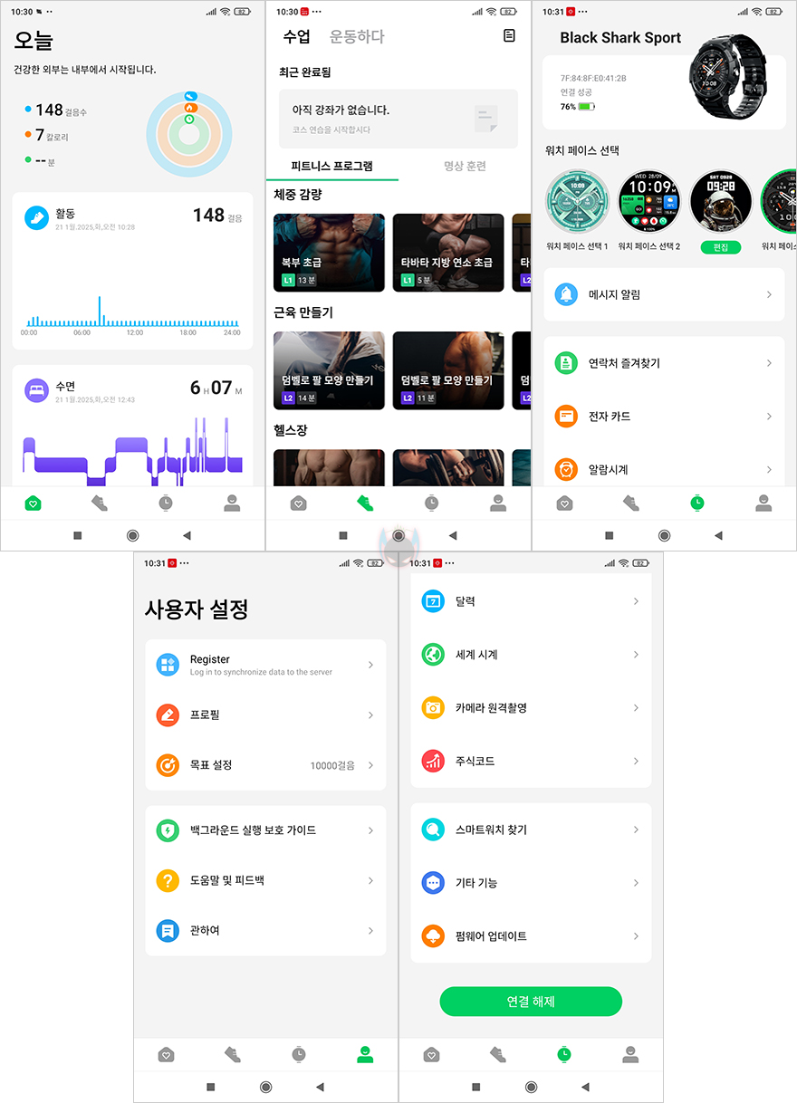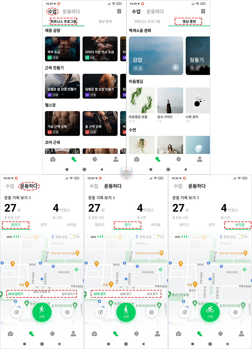 이번엔 GS3 SPORT 스마트워치와 연동되는 Shark Fitlife 앱을 살펴보면, 메뉴는 하단에 크게 4가지로 오늘, 운동, 장치, 사용자설정의 프로필로 나뉩니다. 오늘 메뉴에는 칼로리 및 활동량을 비롯해 수면, 심박수, 산소포화도, 스트레스, 체중 등의 일일 정보를 확인할 수 있습니다. 그리고, 운동 메뉴에선 수업/운동하다 2가지 메뉴로 나뉘는데, 수업은 영상을 제공해 주면서 따라 할 수 있도록 피트니스와 명상으로 나뉩니다. 그리고, 운동하다는 말그대로 운동기록을 시작해서 확인할 수 있는데, GPS 달리기와 GPS 걷기, 사이클 운동을 확인할 수 있죠.