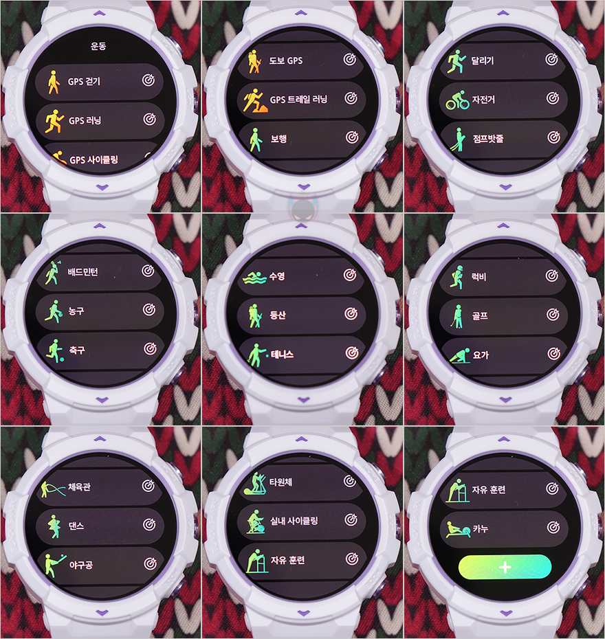 앱 기능을 먼저 살펴보기 전에 GS3 SPORT 스마트워치 자체의 기본 메뉴부터 살펴보면, 앞서 언급했듯이 디스플레이 크기는 1.43인치에 AMOLED 디스플레이에 466x466 해상도와 326 PPI 픽셀밀도, 그리고 60Hz 주사율로 선명한 화질을 제공합니다. 그리고, 기본 화면인 시계 화면에서 아래로 터치 슬라이드하면 퀵-메뉴(Quick menu)가 나오는데, 총 18개의 메뉴를 확인할 수 있으며, 바로 실행하는 기능 메뉴부터 설정 메뉴까지 다양합니다. 그리고, 위로 터치 슬라이드를 하면 메시지 확인을 할 수 있고, 왼쪽으로 터치슬라이드하면 활동량, 수면데이터, 심박수측정, 혈액산소(SpO₂), 날씨까지 기본설정으로 5가지 정보를 확인할 수 있으며, 여기서 추가로 사용자가 더 원하는 정보를 볼 수 있게 추가할 수 있습니다. 또한, 시계 화면에서 오른쪽으로 터치 슬라이드하면 역시 일부 메뉴를 바로 실행할 수 있는 메뉴들이 나오고, 시계화면에서 측면 HOME 버튼을 누르면 전체 메뉴 목록들을 확인할 수 있으며, MODE 버튼을 누르면 바로 운동모드 메뉴목록으로 들어갑니다.