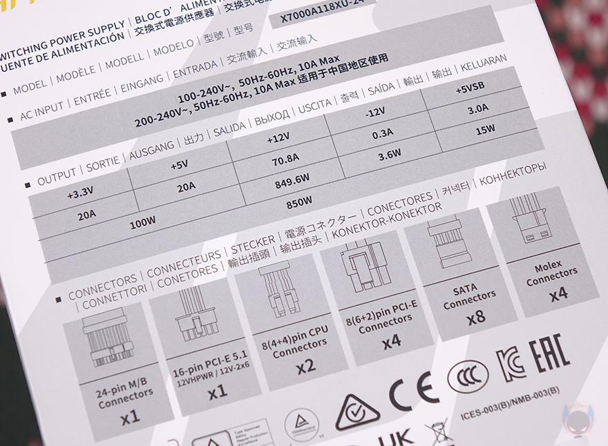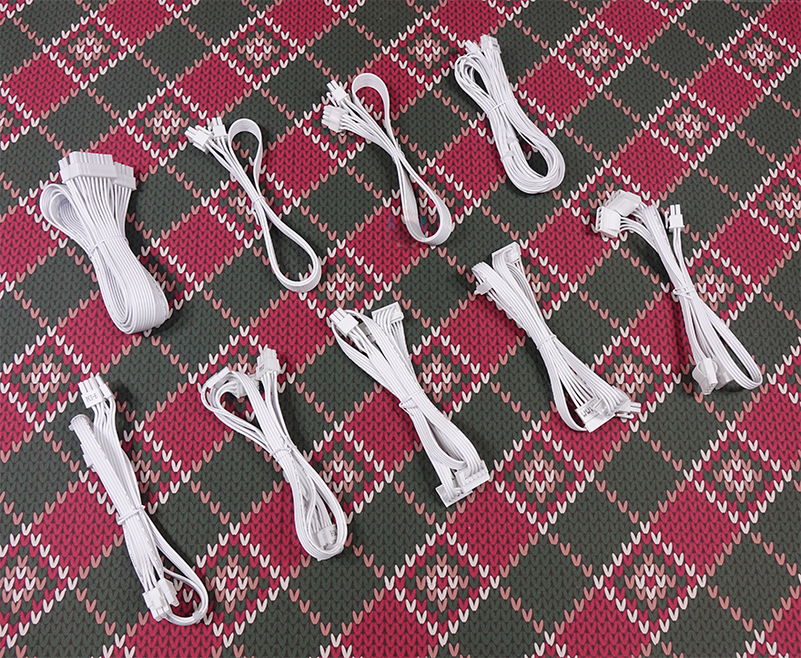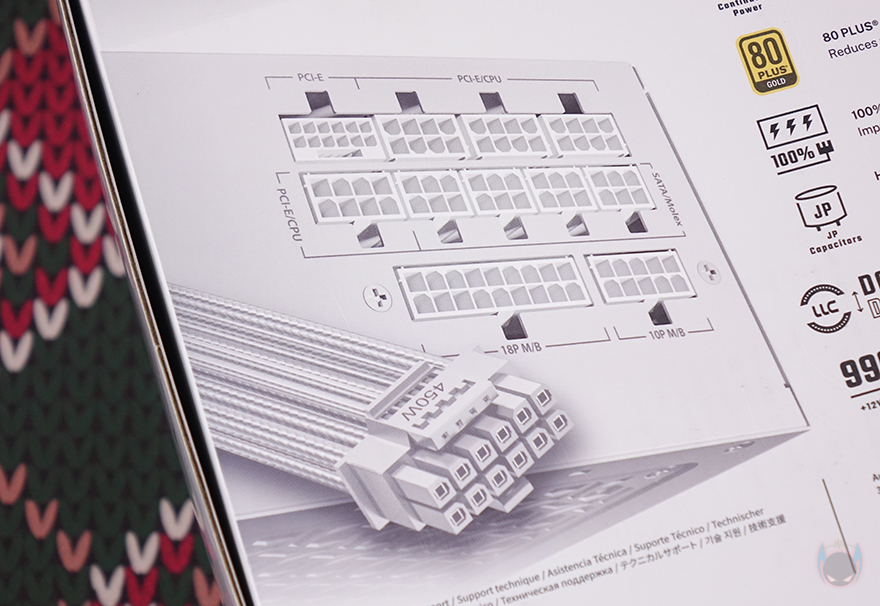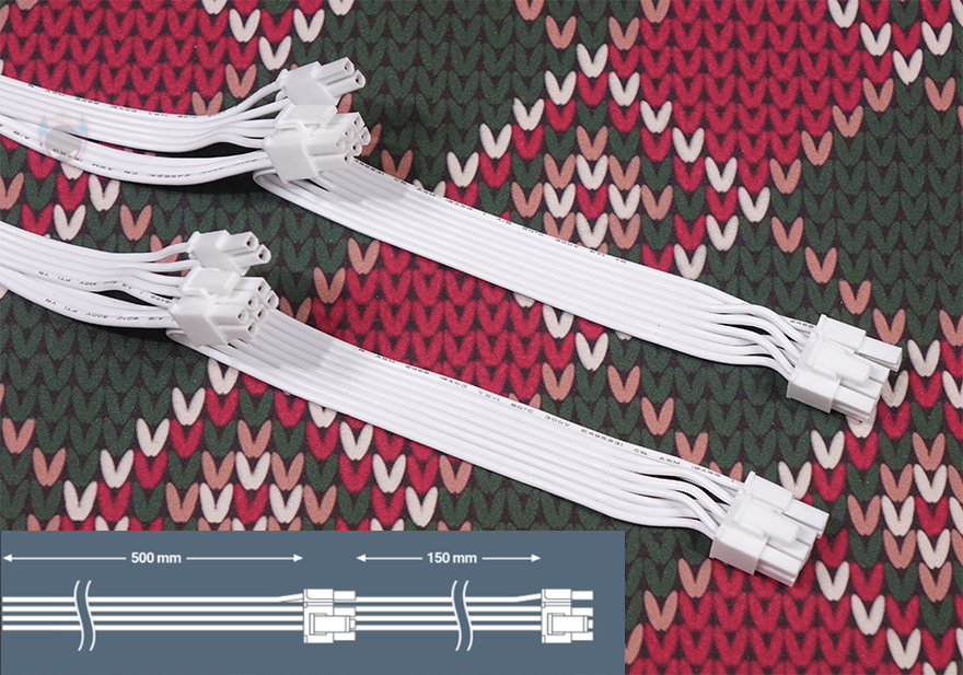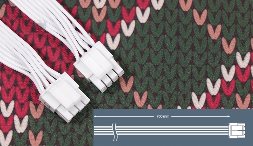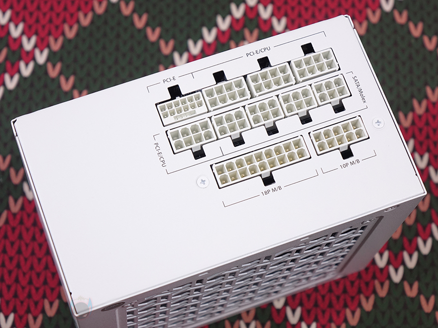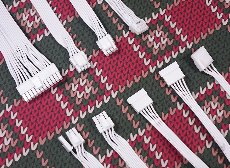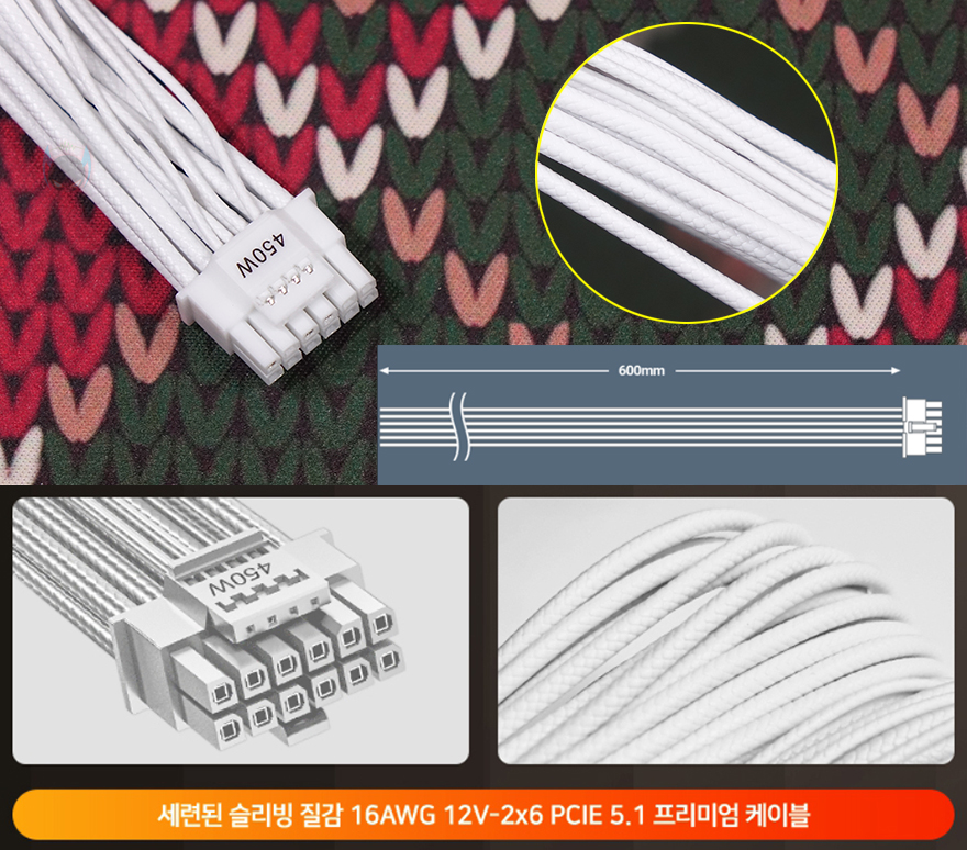 분리형 케이블은 총 9개 구성으로 앞서 만난 GSK 750W 블랙과 동일합니다. 즉, GSK 시리즈의 750W와 850W 구성은 용량에만 차이를 두고 있다라는거죠. 또한, 화이트 모델이기 때문에 본체와 마찬가지로 케이블도 전체가 화이트 색상으로 적용되었는데, 커넥터 색상까지 화이트로 깔맞춤 되었습니다. 케이블 길이 역시 GSK 750W와 동일하며, 커넥터 지원도 메인보드 24핀 1개, ATX 보조전원 8(4+4) 핀 2개, PCIe 16핀(12V-2x6) 1개, PCIe 8(6+2) 핀 4개, S-ATA 8개, P-ATA 4개 구성으로 동일하죠. 단, 850W 모델 같은 경우 용량이 더 크기 때문에 PCIe 16핀의 최대 전력공급량이 450W로 750W보다 더 많으며, 전선규격 역시 16 AWG를 사용해 받쳐주고 있습니다. 케이블형태도 나머지 케이블들은 일반 플랫(Flat) 타입이지만, PCIe 16핀은 유연성이 더 강조되기 때문에 슬리빙케이블을 사용했습니다.