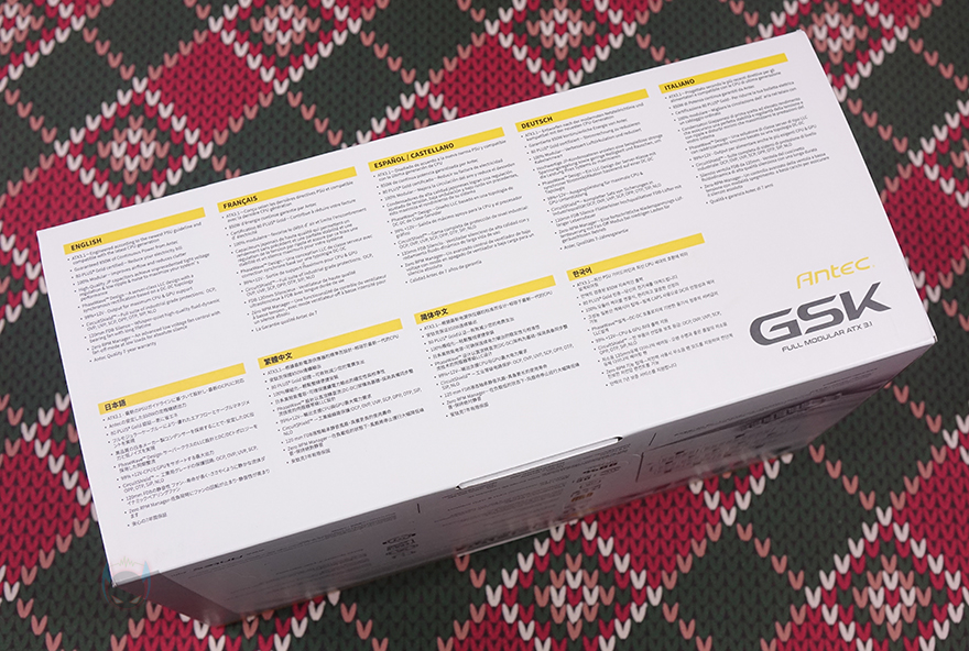 박스 한쪽 측면에는 제품의 크기 사이즈를 표기해놨고, 앞선 시간에 만난 GSK 750W 모델과 마찬가지로 크기는 동일하며, 요즘 트렌드인 깊이 140mm의 컴팩트 사이즈로 나왔습니다. 반대쪽 측면에는 제품의 기본 사양과 커넥터 개수 표기를 확인할 수 있고, 또 다른 박스 측면에는 한국어를 포함해 다국적 언어로 주요 특징을 표기해 놨죠. 박스 후면에는 추가 제품 이미지로 풀-모듈러 방식과 PCIe 16핀이 12V-2x6 커넥터 이미지를 함께 담고 있습니다. 이미지 오른쪽에는 다시 한번 주요 특징 언급을 확인할 수 있죠.