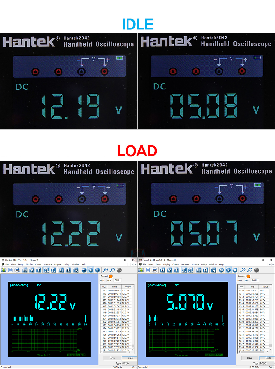 그럼, Antec(안텍) GSK 850W 화이트 파워서플라이를 일반 PC 시스템 기반에서 OCCT 프로그램을 통해 CPU와 그래픽카드 전원공급에 주요 전압이 12V와 주변 장치 주요전압인 5V의 출력상태를 확인해 보는데, 시스템 기반은 AMD 라이젠 7 7800X3D CPU, 인텔 아크 A770 그래픽카드로 OCCT 프로그램 10분간 Load 상황과 대기상태의 Idle 상황에서 각각 전압 출력 움직임을 확인해 봤습니다. CPU와 그래픽카드 전력공급의 주요 전압이 12V 같은 경우 Idle에선 0.01V, Load에선 0.02V, 전체 변동폭도 0.03V대로 매우 작은 편임을 확인할 수 있어서 일명 칼전압으로 안정적인 출력을 유지했습니다. 주변 장치 전력공급의 5V 전압 역시 12V와 비슷하게 Idle에선 변동 없고, Load 상황에선 0.01V, 전체 변동폭도 0.01V 수준으로 매우 작은 편으로 역시 안정적인 출력을 유지했습니다. 따라서, PC를 구성하는 부품들에 전력공급에 있어서는 불안감을 가질 필요 없겠습니다.
