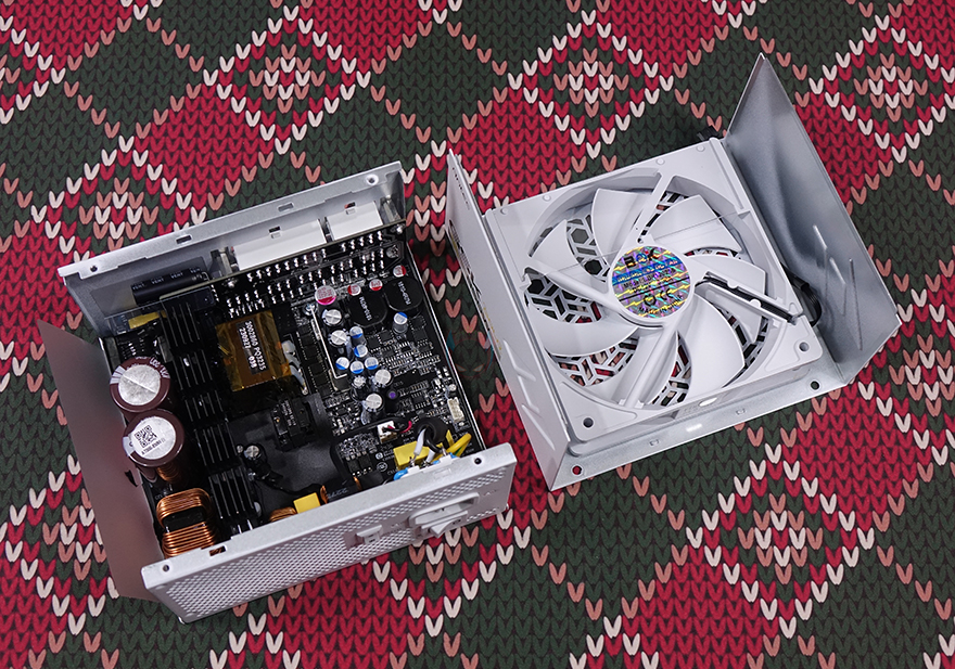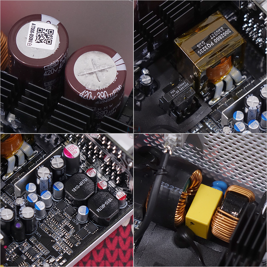 Antec(안텍) GSK 850W 화이트 파워서플라이의 내부를 잠깐 살펴보면, 화이트 콘셉트에 맞춰서 내부에 장착된 120mm 팬 역시 화이트 팬으로 적용했으며, 앞서 언급했듯이 제로팬 기술이 적용되었기때문에 자동속도조절로 작동됩니다. 또한, 공기흐름 유지를 위해 에어가이드도 기본 장착되어 있고, FDB베어링으로 저소음팬을 사용했죠. 내부를 좀 더 살펴보면, 메인 캐패시터 같은 경우 850W 모델 역시 일본산 캐패시터가 사용되었는데, 750W와 달리 2개의 캐패시터 모두 일본 니치콘 제품을 사용했으며, 750W보다는 용량이 큰 만큼 420V/390㎌와 420V/470㎌용량을 사용했습니다. 이밖에도 DC to DC+LLC 설계, Active PFC, 고주파음 최소화를 위한 EMI 필터 등을 육안으로 쉽게 확인할 수 있으며, 850W 모델에도 총 8가지의 보호회로 기술이 적용되었습니다.