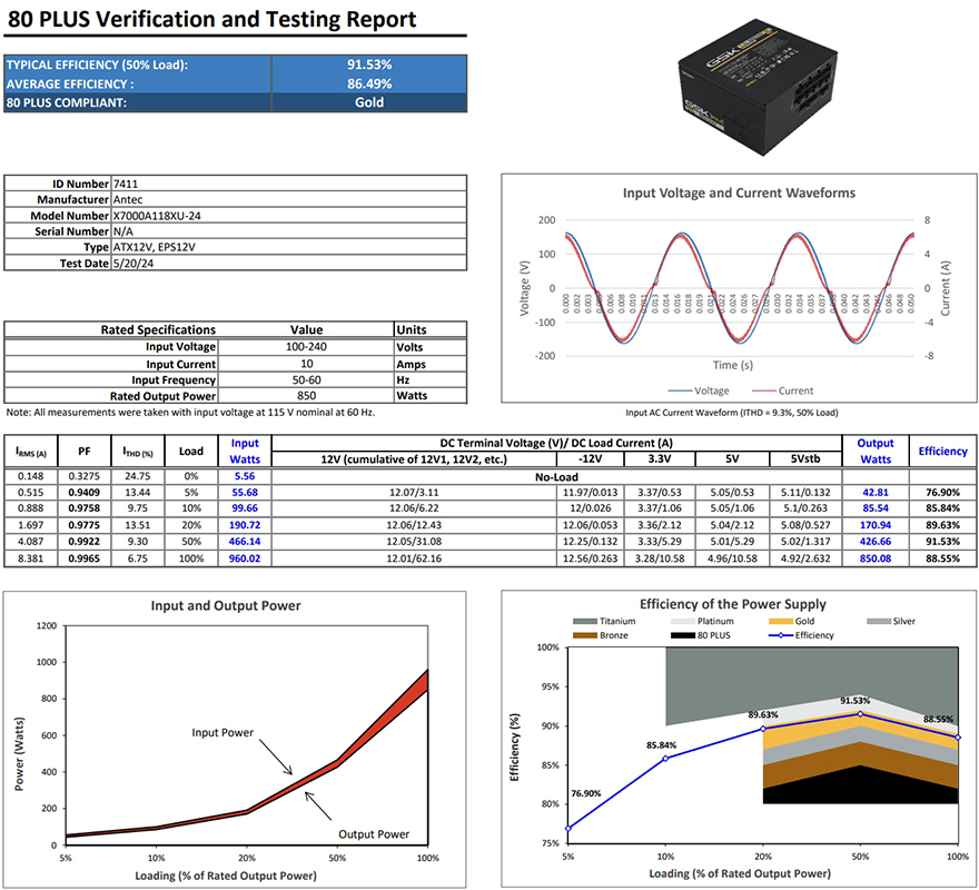 Antec(안텍) GSK 850W 화이트 파워서플라이 역시 앞서 만난 750W 블랙 모델과 마찬가지로 80Plus 골드 등급의 전력효율 인증을 받았습니다. 실제 80 Plus에 등록된 GSK 850W 모델의 인증 결과 데이터 자료를 확인해 보면, 평균 86.49% 효율과 50% Load 시 91.53%의 전력효율 결과를 확인할 수 있어서, 소비전력에서 낭비되는 전력이 낮아 전기세 절약에도 도움이 되겠습니다. 끝으로, 기본 작동상태에서 팬 소음을 근접거리에서 측정해 보면, 약 36dB(A)로 정숙한 편임을 확인할 수 있으며, 실제 PC케이스 내부에 장착되는 점을 고려하면 더 작게 들리게 되고, 주변 다른 부품들의 팬 소음에 묻히는 소음대라 파워서플라이의 소음 불편은 없겠습니다.
