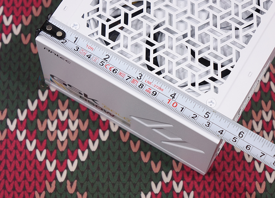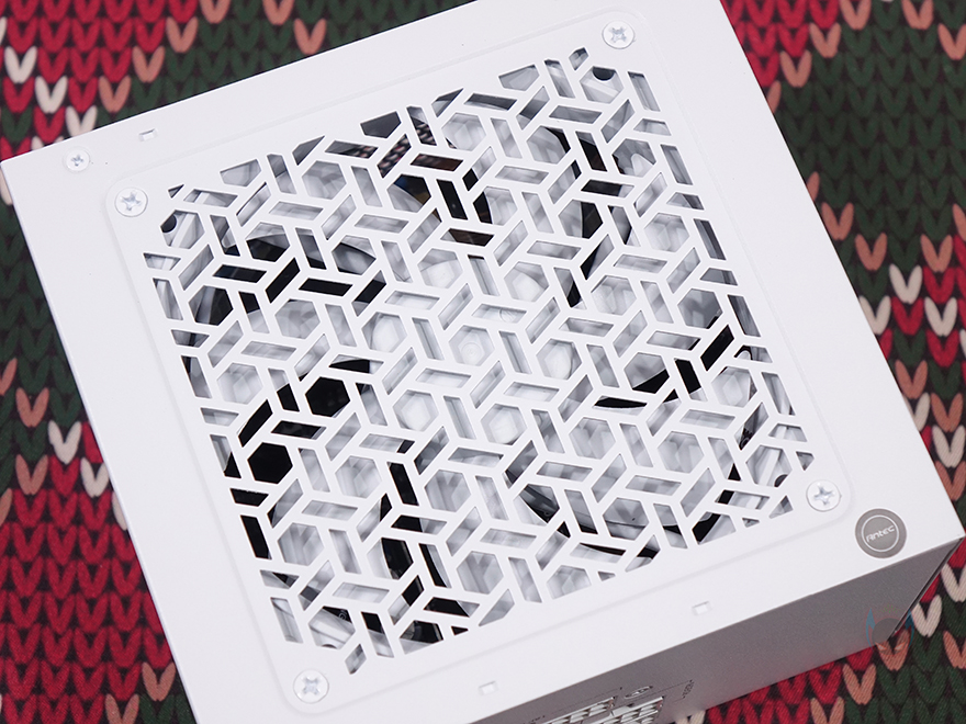 Antec(안텍) GSK 850W 화이트 파워서플라이 본체부터 살펴보면, 본체 색상은 화이트로 앞서 먼저 만난 블랙색상의 GSK 750W와 동일한 디자인에 색상만 차이를 두고 있습니다. 또한, 크기 역시 ATX 규격으로 최소한의 크기인 깊이 140mm로 앞서 박스에서 확인한 150x140x86mm 사이즈를 가졌죠. 본체 상단에는 패턴 디자인의 에어홀 처리와 함께 내부에 120mm 팬이 기본 장착된 것을 확인할 수 있는데, 제품 색상에 맞춰 화이트 색임을 미리 알 수 있습니다. 또한, 후면부 역시 내부 발열 배출로 벌집 모양의 에어홀 디자인을 적용했으며, 팬 작동 모드를 무소음과 상시 작동으로 선택할 수 있는 하이브리드 스위치도 적용했습니다. 흔히 말하는 제로팬 기술이죠. GSK 시리즈 경우 하이브리드 On 즉, 제로팬 모드를 켜면 내부 온도 40℃이상부터 팬이 작동하며 그 아래 온도까지는 무소음으로 팬이 작동하지 않습니다.