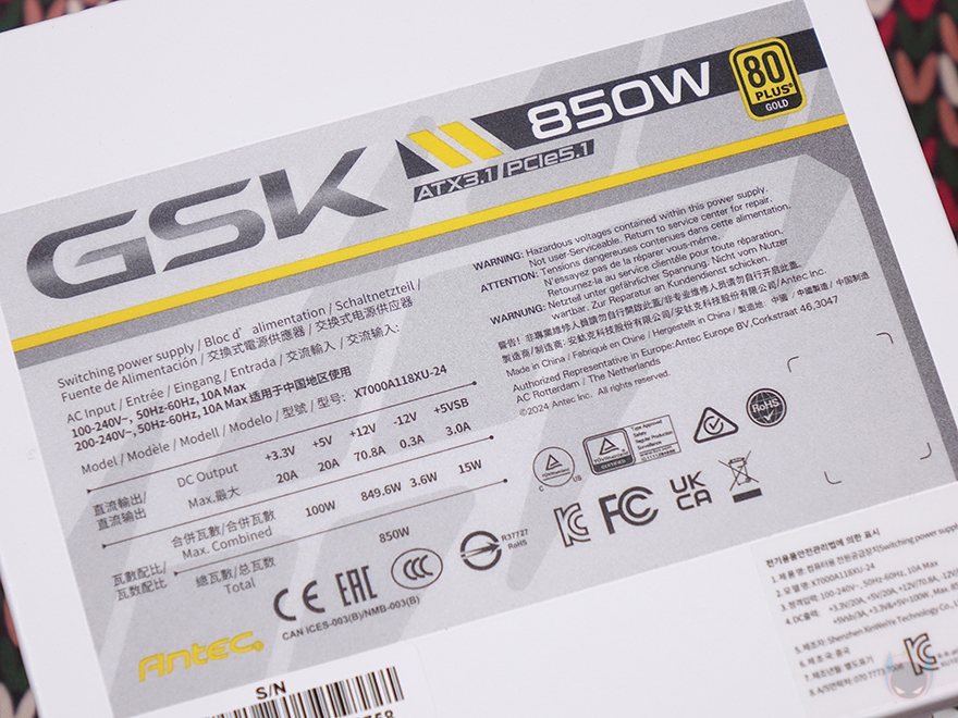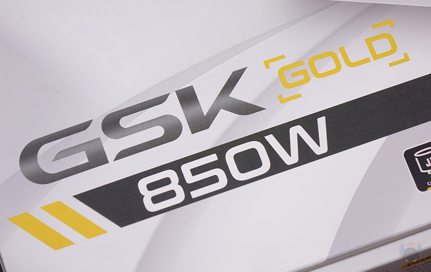 본체 전면에는 풀-모듈러 방식 제품이라 분리형 케이블들과 연결되는 커넥터들이 배치되어 있는데, 블랙색상 모델과 마찬가지로 화이트 모델에서도 한쪽 방향 정확히는 파워서플라이를 장착했을 때 일반적으로 오른쪽 방향이 바깥쪽임을 고려해 커넥터들이 배치되어 있습니다. 이렇게 배치하면 PC케이스에 장착한 상태에서도 손쉽게 케이블들을 분리/장착할 수 있죠. 그리고, 양쪽 측면에는 동일하게 모델명과 GSK 로고 음각처리를 해놨으며, 본체 밑바닥부분에는 박스에서 확인한 제품의 기본 사양 표기를 다시 확인할 수 있고, 국내 공식수입사 (주)뉴런글로벌을 통해 정식 발매된 제품이라 KC인증도 확인할 수 있습니다.