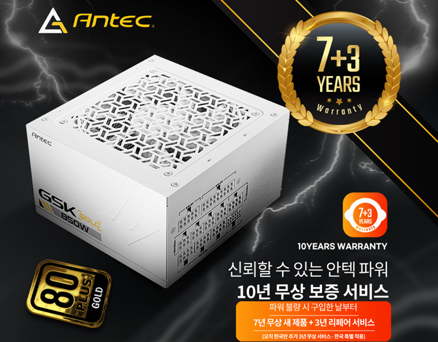 시작에서 언급했듯이 최근 조립PC 시장에서 화이트 콘셉트로 맞추는 소비자들이 많습니다. 특히, 요즘 같은 졸업과 새 학기 시즌에 겨울철에 더 수요가 많죠. 이런 시점에서 Antec(안텍)이 최신 ATX 3.1 규격으로 선보인 새 시리즈 파워서플라이 GSK 시리즈에 유일한 화이트 모델인 GSK 850W 화이트 모델은 본체부터 분리형 케이블과 커넥터까지 올-화이트로 나와 화이트 콘셉트 조립 PC 구상시 화이트 파워서플라이로 소비자에게 충분히 선택받을 수 있는 매력을 가지고 있습니다. 최신 규격인 만큼 인텔/AMD 최신 CPU 지원은 물론이고, 최근에 출시되기 시작한 RTX 50시리즈 그래픽카드, 곧 출시를 앞둔 AMD의 9000 시리즈 라데온 그래픽카드까지도 완벽 지원하죠. 여기에 PC파워 시장에 트렌드인 140mm 깊이로 컴팩트한 크기를 가지고 있어서 조립 시 PC케이스 공간 확보에도 도움이 되며, 필요한 케이블만 장착해서 사용할 수 있는 풀-모듈러 방식이라 유용합니다. 또한, 80 Plus 골드 등급에 한국 시장에서는 (주)뉴런글로벌 공식수입사를 통해 글로벌 보증기간 7년에 한국 시장 추가 3년을 더한 최대 10년 무상 보증기간을 지원해주고 있어서 오랫동안 마음 놓고 사용할 수 있죠. Antec 하면 원래 PC케이스와 파워서플라이로 유명했던 만큼 올겨울 화이트 조립 PC를 구상하고 있었다면, 파워서플라이는 Antec GSK 850W 화이트 모델로 추천해 봅니다.