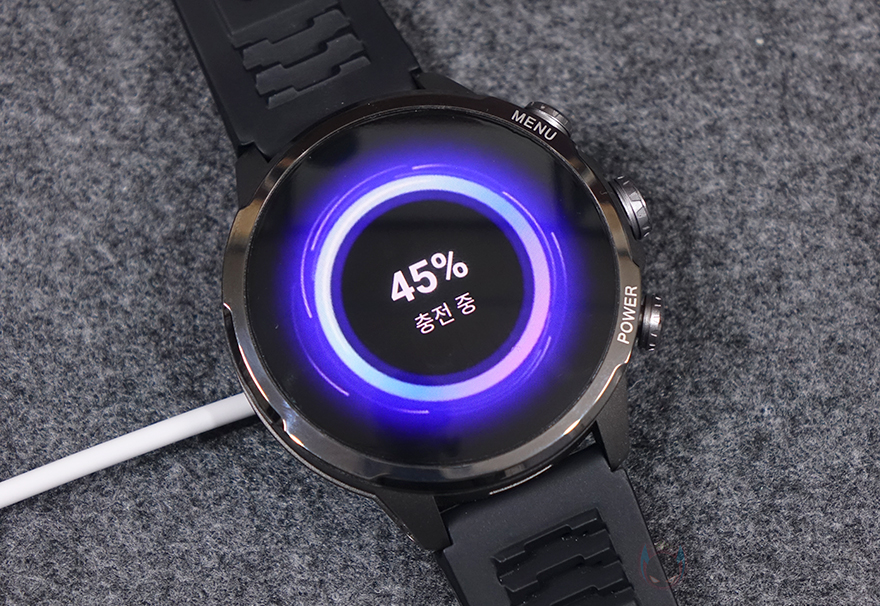 스트랩(Strap) 같은 경우 기본 장착된 스트랩은 가죽 재질로 일반 시계처럼 클래식한 감성이 보이도록 했으며, 바깥쪽과 안쪽 질감 색상도 다릅니다. 또한, 일반 시계처럼 손목 굵기에 따라 착용 조절을 할 수 있게 구멍이 있으며, 안쪽 스트랩과 시계 연결부위는 다른 스마트워치 제품들처럼 핀 방식으로 반대방향으로 핀을 당기면 분리를 할 수 있죠. 만약, 기본 장착된 가죽재질의 스트랩을 선호하지 않는다면, 추가 교체용으로 제공되는 실리콘 스트랩으로 교체해 사용하면 됩니다. 끝으로, 충전기는 Watch X Pro 전용 충전기로 기존의 자사 제품들과 호환은 되지 않으며, 마그네틱과 포고-핀 방식으로 Watch X Pro 후면에 장착해서 충전시켜 줍니다.