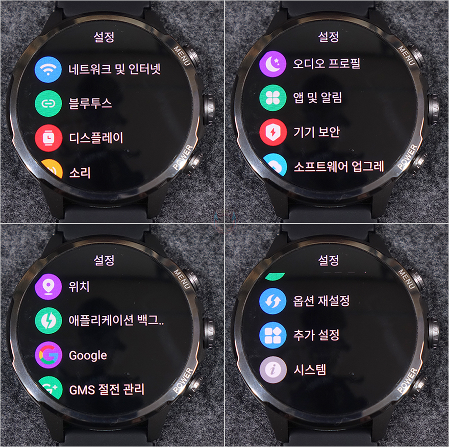 따로 제품과 연동되는 앱이 없기 때문에 계속 Watch X Pro 스마트워치 자체에 담긴 기능들 위주로 살펴보는데, 일단 측면 메뉴(Menu) 버튼을 누르면 기능 메뉴들을 확인할 수 있습니다. 전화와 메시지 기능은 앞서 언급했듯이 유심카드를 사용했을 때만 이용이 가능하고, 그 외 기능들은 안드로이드 시스템 기반이기 때문에 구글 계정을 등록하면 사용할 수 있습니다. 기기는 메뉴는 총 32개이며, 설정 메뉴로 들어가면 네트워크, 블루투스 설정을 비롯해 총 15개의 기기 관련 설정 메뉴를 확인할 수 있습니다.