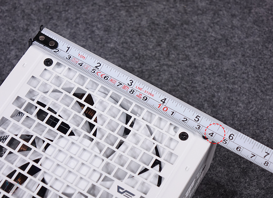 후면부 반대인 전면부에는 앞서 언급했듯이 퍼펙트모스트 시리즈 역시 UPMOST 시리즈와 마찬가지로 풀-모듈러 방식을 적용하고 있습니다. 그래서, 전면부에는 분리형 케이블들과 연결되는 커넥터들이 배치되어 있는데, 커넥터들마다 용도 표기를 해놔서 쉽게 구분할 수 있으며, UPMOST 시리즈에선 외관 색상과 상관없이 블랙색상의 커넥터가 적용되었는데, 이번 퍼펙트모스트 시리즈에는 외관 색상에 맞춰 커넥터도 통일시켰습니다. 그래서, 화이트 모델에는 화이트색상의 커넥터가 적용되어 있죠. 이밖에 본체 측면에는 모델명을, 본체 밑바닥 부분에는 다시 한번 제품의 기본 사양표기를 확인할 수 있습니다.
