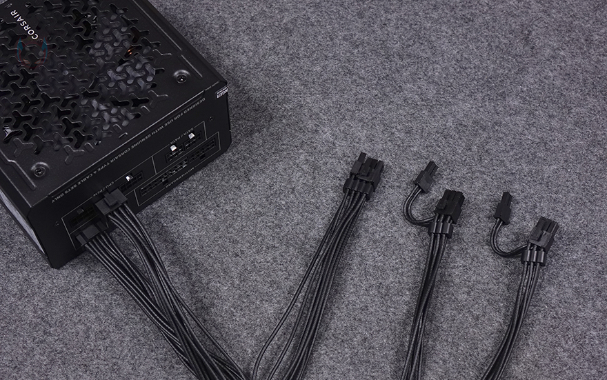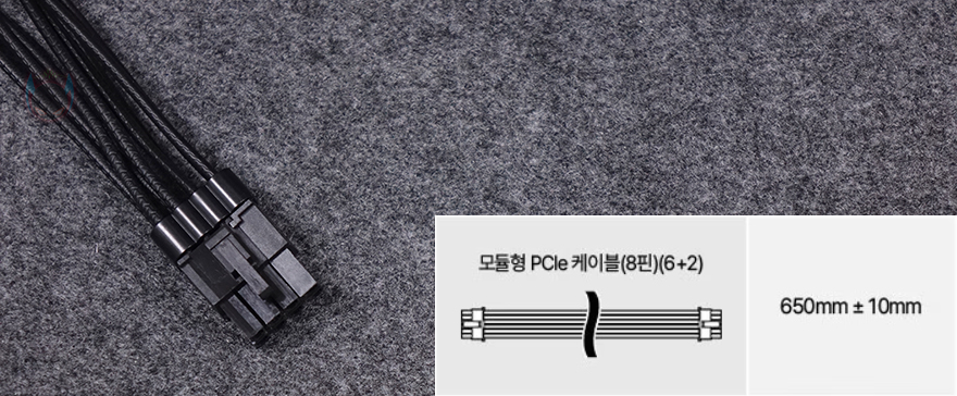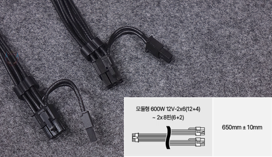 RM850e ATX 3.1 파워서플라이 같은 본체와 연결되는 분리형 케이블은 총 8개이며, 케이블에서도 이전 ATX 3.0 모델과 달라진 점이 있는데, 바로 케이블 형태로 이전 ATX 3.0 모델에선 플랫(Flat) 타입을 사용한 반면, 이번 모델에선 좀 더 고급스러운 메쉬 패턴 슬리빙 케이블이 사용되었습니다. 메쉬 패턴 케이블은 전선에 바로 슬리빙처리가 된 케이블로 일반적인 피복+슬리빙 케이블보다 더 얇으면서 플랫타입 케이블보다 더 유연하죠. 그래서, 고가형 파워서플라이나 커스텀 케이블에 주로 사용됩니다. 또한, 메인보드와 그래픽카드에 연결되는 케이블에는 클립도 적용되어 있죠. 그리고, 방금 본체 커넥터에서 확인했던 PCIe 16핀 12V-2x6 커넥터 연결되는 케이블도 2가지로 제공되는데, 하나는 바로 그래픽카드 PCIe 16핀 12V-2x6 커넥터와 연결되는 케이블, 또하나는 PCIe 16핀 12V-2x6 에서 PCIe 8핀 커넥터로 변경 연결해 주는 일종의 젠더 케이블이 제공됩니다. 이런 젠더 케이블이 제공되는 이유는 일부 그래픽카드에서 PCIe 16핀 12V-2x6 커넥터를 PCIe 8핀 3개 커넥터로 변경해주는 젠더 케이블이 제공되는 경우가 있기 때문에, 이에 맞춰 지원하고 있는 거죠. 그래서, RM850e ATX 3.1 모델은 총 3개의 PCIe 8핀 커넥터 연결이 가능합니다. 이밖에 케이블 길이는 요즘 PC케이스에 맞춰서 넉넉한 길이를 가졌습니다.