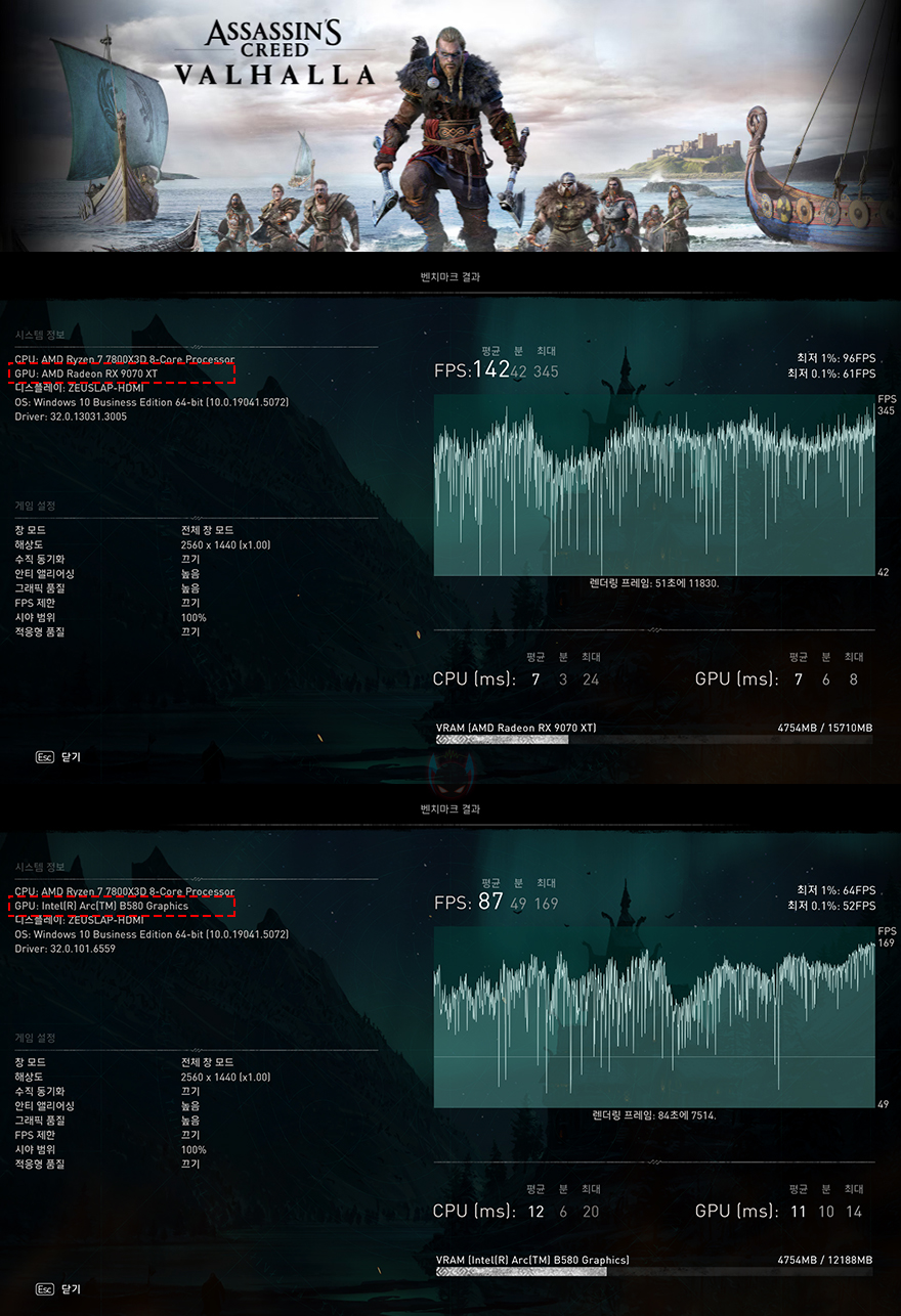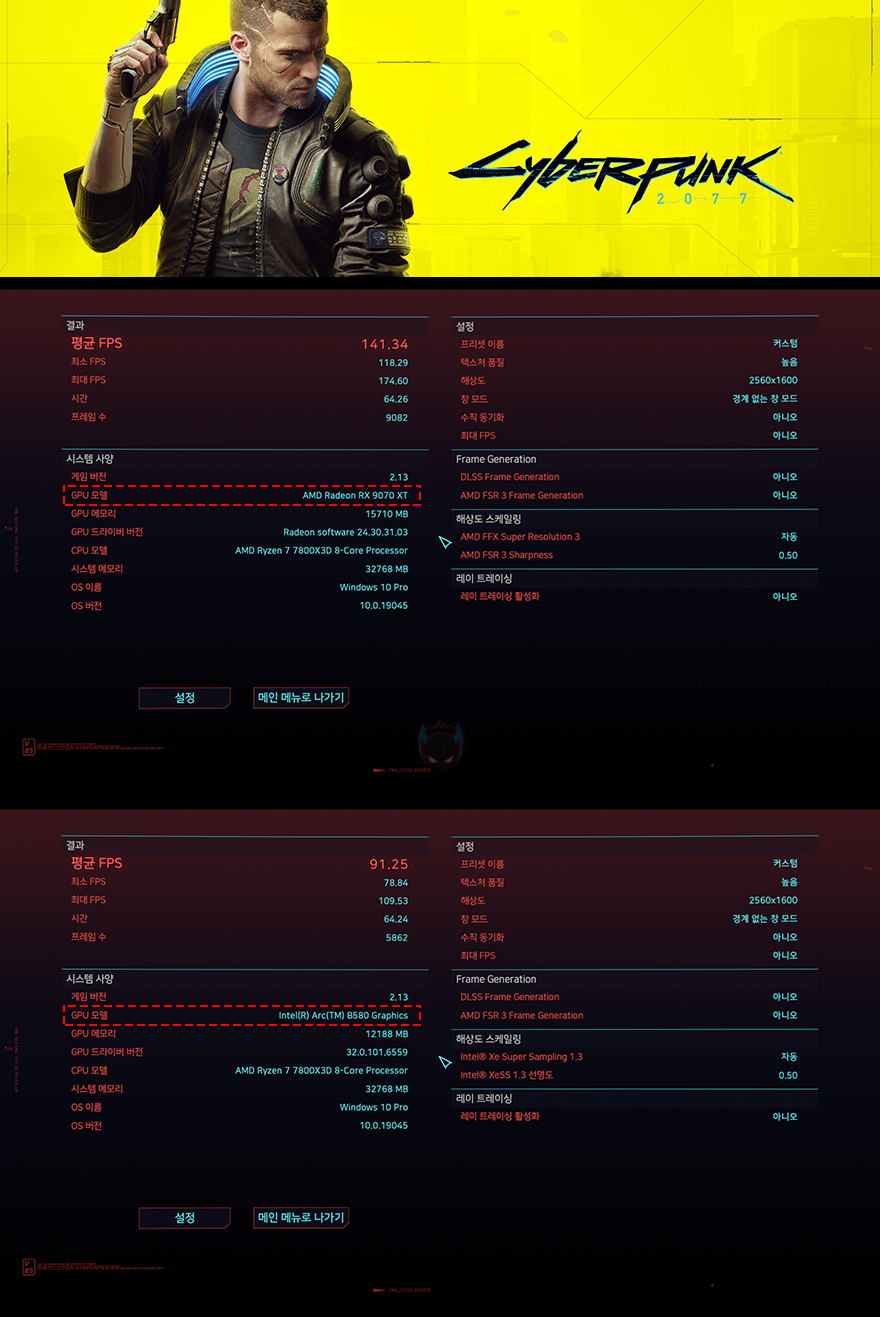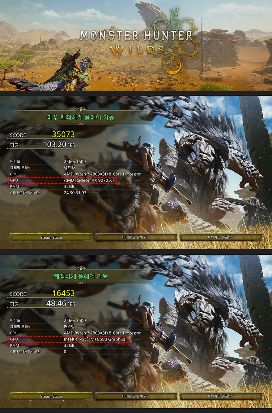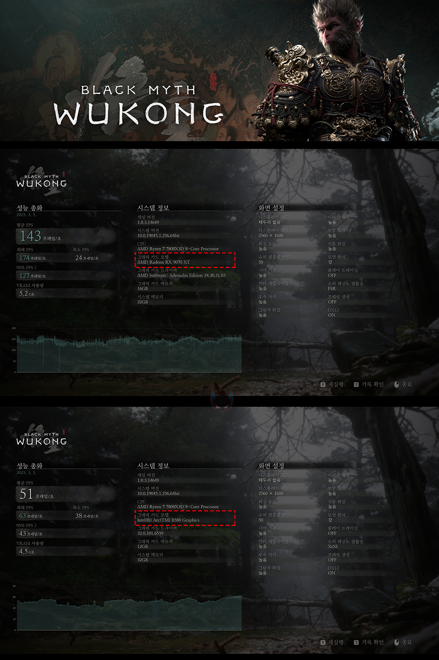 이번엔 DirectX 12 기반의 최신 게임 및 고사양 게임 위주 5종을 High옵션 프레임 벤치마크로 XFX 라데온 RX 9070 XT SWIFT 그래픽카드의 성능을 확인해 보면, 게임 프레임 성능에서도 메인스트림급 인텔 아크 B580 그래픽카드는 최신 게임과 시기가 좀 지난 고사양 게임에서도 100 프레임을 넘기기 힘든 반면, XFX 라데온 RX 9070 XT SWIFT 그래픽카드는 100프레임을 쉽게 넘기는 모습을 확인할 수 있으며, 가장 최근에 출시된 몬스터헌터 와일즈나 트리플 A 게임으로 분류되는 검은 신화 오공 같은 최신 게임에서도 2배 이상의 프레임차이를 보였습니다. 다만, 일부게임에선 최소프레임이 현저히 낮게 나오는 경우가 있어서 최적화는 좀 더 필요할 것으로 보입니다.