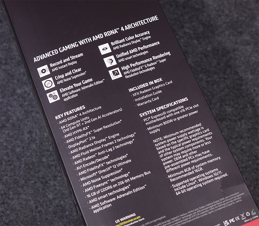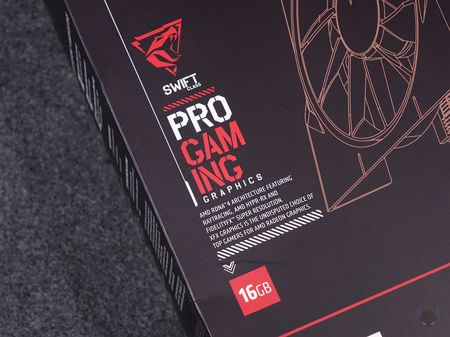 제품 박스부터 살펴보면, XFX 특유의 세로형 박스 디자인으로 전면 한쪽에는 측면까지 이어지는 제품 이미지를 담고 있습니다. 실물 이미지는 아니지만, 그림형식이라서 개봉전에 미리 제품 디자인정도는 가늠이 되고, 바로 옆에는 XFX의 기본 베이스 라인업인 SWIFT 표기와 함께 메모리 용량 표기도 확인할 수 있는데, 이번 라데온 RX 9000 시리즈로 넘어오면서 XFX의 등급에도 변화가 생겼습니다. 기존 4등급에서 3등급으로 머큐리(MERCURY), 퀵실버(QUICKSILVER), SWIFT(스위프트)죠. 또한, 이전까지는 약자로 표기했었는데, 이제 풀네임과 함께 클래스(CLASS)라는 명칭을 붙였고, 등급별마다 엠블럼도 새롭게 적용되었습니다. 그리고, 박스 각 측면에는 모델명과 AMD의 주요 기술 및 구성품 목록과 시스템 사양 표기를 해놨죠.