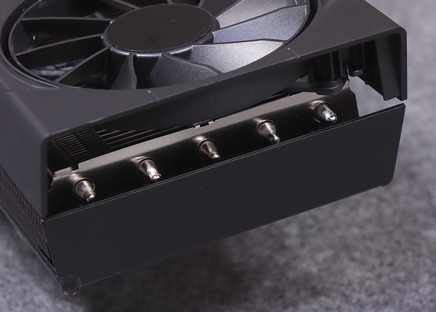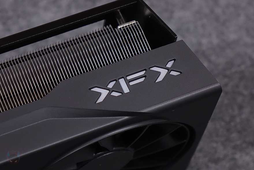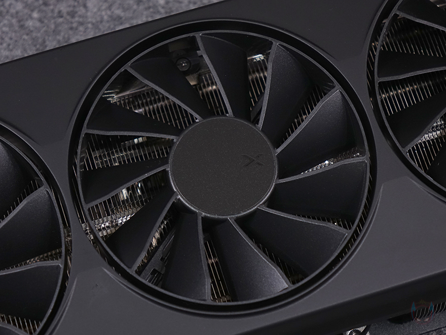 좀 자세히 XFX 라데온 RX 9070 XT SWIFT 그래픽카드를 살펴보면, 일단 쿨링시스템 역할의 쿨러는 트리플-팬 구성으로 팬을 감싸는 쿨러 케이스 부분은 무광처리로 심플한 디자인과 함께 차분한 감성을 줍니다. 그래서, 화이트 모델 같은 경우에는 제조사에서 서리가 내린 디자인(Frosty design)이라고 언급하고 있습니다. 또한, 팬 크기는 95mm로 각 팬마다 총 11개의 블레이드를 가졌고, 특이하게 팬 날개 주변으로 테두리 프레임을 별도로 적용하고 있습니다. 일종의 터빈-팬 같은 디자인으로 이 역시 쿨링효과를 극대화하기 위한 설계라 할 수 있습니다. 참고로, 팬 베어링도 듀얼 볼 베어링으로 긴 수명과 소음 최소화가 되도록 했죠. 그리고, 쿨러 측면에는 맨 오른쪽에 XFX 로고를 확인할 수 있는데, 뒤에서 확인하겠지만, 로고 부분에서 라이트닝 효과를 볼 수 있고, 측면에서 듀얼 바이오스 스위치와 PCIe 8핀 보조전원 2개가 배치된 것을 추가로 확인할 수 있습니다. 또한, 측면에서 쿨러의 방열핀도 간접적으로 확인할 수 있는데, 오른쪽 측면에서 방열핀을 통과하는 히트파이프도 5개가 적용되었다라는 걸 확인할 수 있습니다.