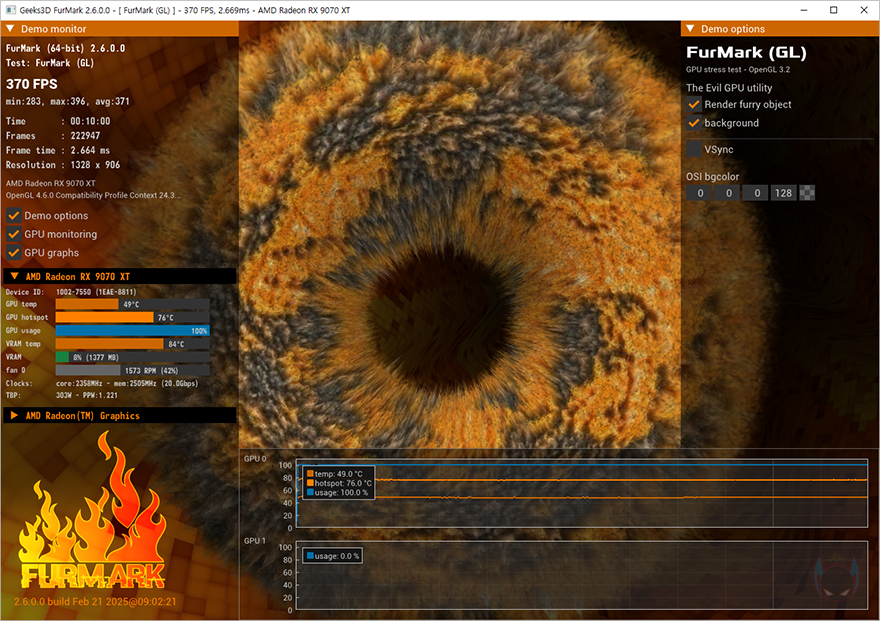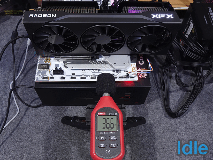 끝으로, XFX 라데온 RX 9070 XT SWIFT 그래픽카드의 쿨러 즉 쿨링 효과를 확인해 보는데, Furmark를 10분간 과부하인 Load 상황에서 GPU 온도를 확인해 보면 49~51℃ 선임을 확인할 수 있습니다. 상당히 낮은 편임을 확인할 수 있죠. 또한, 메모리 부분도 84℃로 준수한 편이라 장착된 트리플 팬 쿨러의 쿨링 효과는 상당히 뛰어나다 할 수 있으며, 10cm 근접 거리에서 Idle과 Load 상황에서 소음 측정을 했을 때도 약 37dB과 약 52dB로 정숙한 편임을 확인할 수 있습니다. 실제 PC케이스 내부에 장착되면 더 작게 들리겠죠.