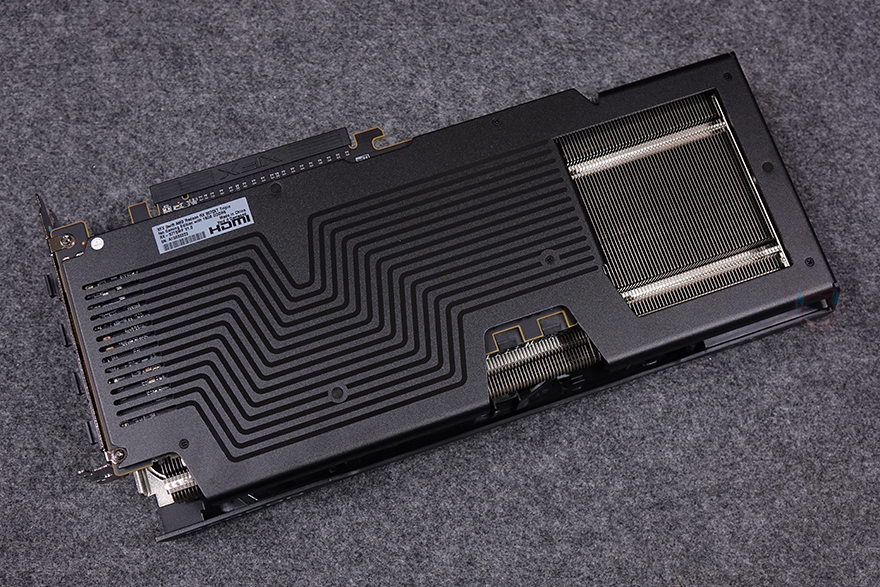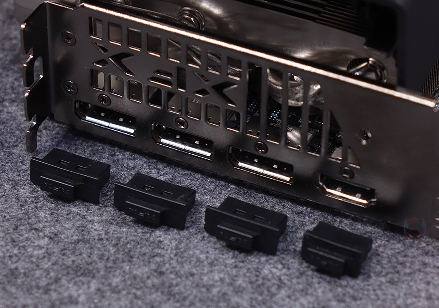 XFX 라데온 RX 9070 XT SWIFT 그래픽카드 후면에는 제품 박스에서 확인했듯이 백플레이트를 기본 장착하고 있으며, 특유의 패널 디자인과 함께 맨 오른쪽에는 PCB기판이 없기 때문에 쿨러 방열핀의 발열이 신속 배출되도록 큼지막하게 홀-처리를 해놨습니다. 그리고, 메인보드 PCIe 슬롯과 결착하는 PCIe 슬롯도 보관 시 부식 및 먼지 유입방지를 위해 기본 마개를 함께 제공해주고 있으며, 모니터 출력 포트 쪽에는 각 포트마다 마개를 제공해 주고, 포트 구성에는 DP(디스플레이포트) 3개, HDMI 포트 1개로 이루어져 있습니다. 참고로, DP와 HDMI 모두 버전은 2.1입니다.