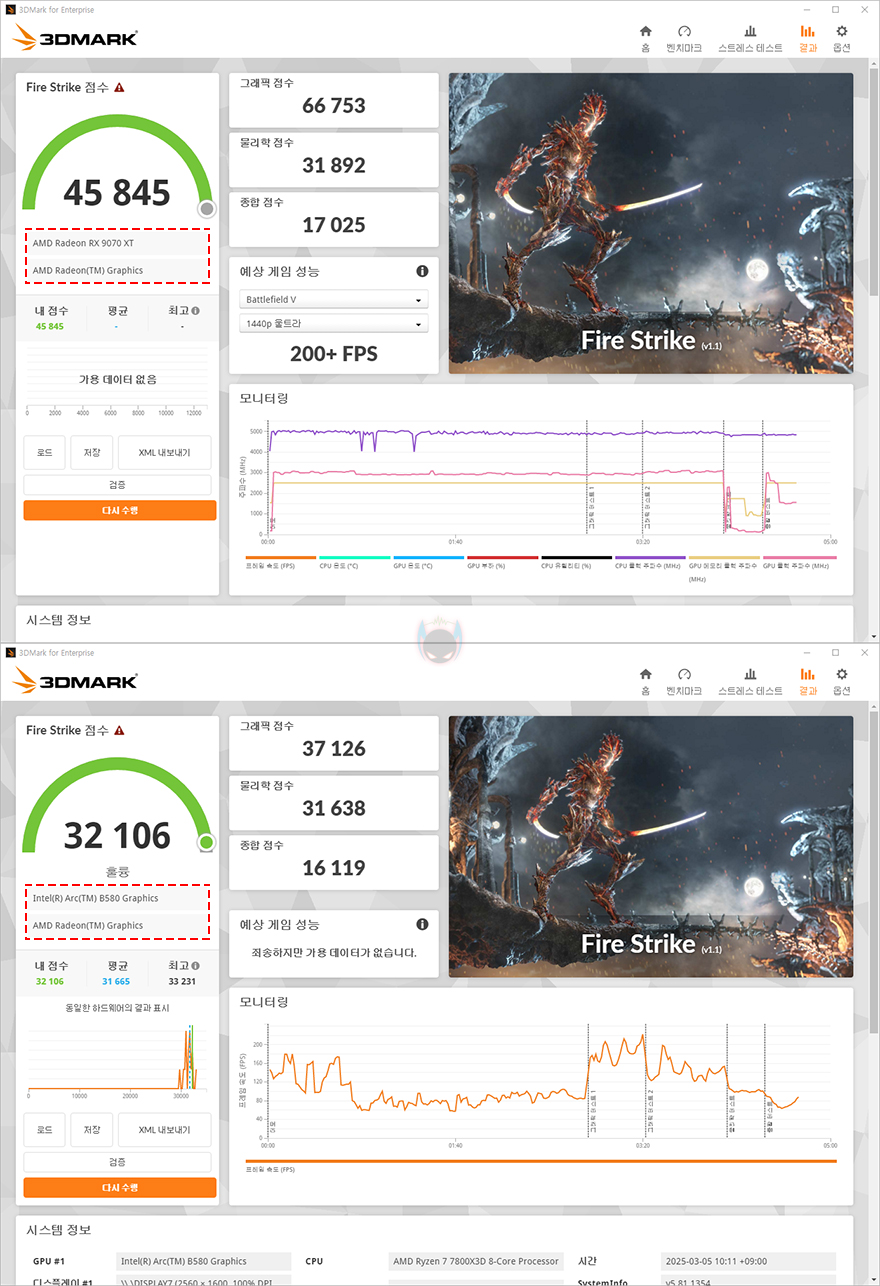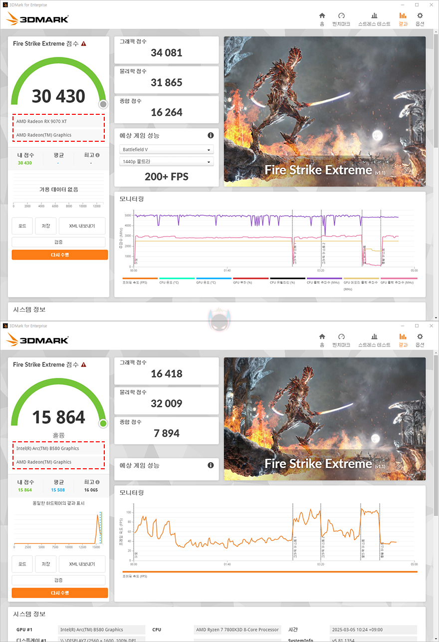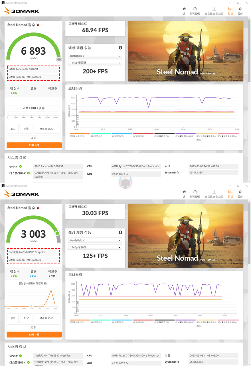 출시 전 공식 발표한 AMD의 라데온 RX 9070 시리즈 정보에 따르면, 라데온 RX 9070 시리즈는 QHD급 해상도 시스템에 겨냥을 맞춰 나온 중급형 그래픽카드입니다. 하이엔드 그래픽카드의 시작이라고도 할 수 있죠. 그래서, 먼저 3DMark를 통해 XFX 라데온 RX 9070 XT SWIFT 그래픽카드의 성능을 확인해 볼 텐데, 비교대상은 체감차이를 위해 메인스트림급으로 평가받는 가장 최근 그래픽카드 인텔 아크 B580으로 선택했으며, DirectX 11, 12 기반과 풀-HD, QHD 옵션 기준에서 실행할 수 있는 항목들로 비교해 본 결과, 확연한 차이 결과를 보여줍니다. 전반적으로 2배에서 2.5배 차이를 보여, 하이엔드 그래픽카드급이라는 걸 쉽게 체감해 줍니다.