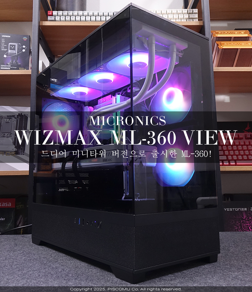 요즘은 조립 PC를 맞출 때 대중적으로 많이 선택하는 메인보드가 M-ATX 폼 타입이죠. 조립 PC를 CPU, 그래픽카드, 저장장치 딱 기본 구성으로만 맞출 거면 굳이 ATX 폼 타입의 메인보드까지는 필요가 없습니다. 그래서, 메인보드 제조사들도 요즘은 보급형 메인보드를 대부분 M-ATX 폼 타입으로 출시합니다. 그래서, 조립 PC를 맞출 때 PC케이스도 M-ATX 메인보드까지만 장착되는 미니타워를 선택하는 소비자들이 점점 늘어나고 있는데, 현재 PC케이스 트렌드인 파노라마 뷰 일명 어항케이스에서도 이런 미니타워 제품들이 속속 등장하고 있죠. 국내 종합 PC하드웨어 전문업체 (주)마이크로닉스(https://www.micronics.co.kr/) 역시 자사 브랜드의 대표적인 어항케이스 WIZMAX ML 시리즈에 이번에 미니타워 어항케이스가 드디어 출시되었는데, 바로, WIZMAX ML-360 View 입니다. 작년에 미들타워로 출시되어서 만났던 WIZMAX ML-360 Wide View BTF(https://piscomu.com/314943)의 미니타워 버전인거죠. 그래서, 이번 시간에는 마이크로닉스의 WIZMAX ML-360 View PC케이스를 살펴보도록 하겠습니다.