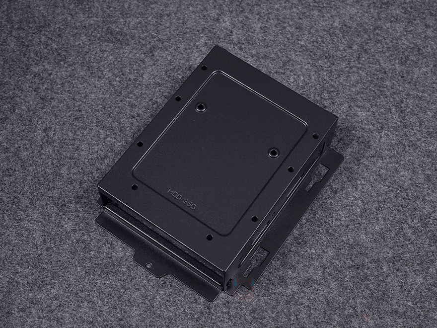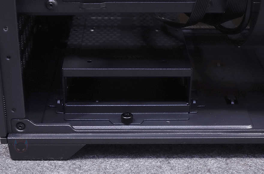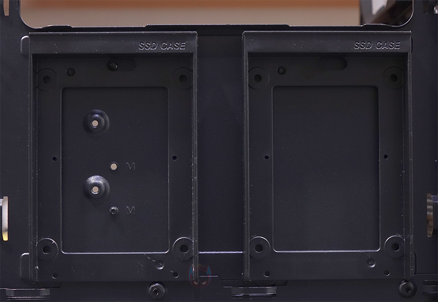 내부 후면, 그러니깐 메인보드 트레이 후면을 살펴보면, CPU-cut-Out 홀 바로 아래에는 2개의 저장장치를 장착할 수 있는 가이드가 장착되어 있습니다. 가이드는 무나사의 푸쉬-핀 방식으로 가이드 윗부분을 누르면 쉽게 분리가 되죠. 가이드에는 2.5인치 SSD/HDD를 장착할 수 있는데, 이때는 나사를 사용해야 합니다. 그리고, 내부 하단 앞자리에는 HDD 베이가 장착되어 있는데, 고정된 손나사를 풀면 베이는 쉽게 분리할 수 있으며, 베이 안쪽에는 기본 3.5인치 HDD를 장착할 수 있고, 베이 외부 상단에는 추가로 3.5인치 HDD 또는 2.5인치 SSD/HDD를 1개 더 장착할 수 있습니다. 또한, 앞서 언급했듯이 베이 좌우 자리이동도 가능하기 때문에 뒷자리 파워서플라이 자리 공간을 좀 더 확보할 수 있죠. 파워서플라이 자리에는 기본 받침대 디자인에 패드도 함께 부착해 놨으며, 메인보드와 연결되는 전면 버튼 및 포트 케이블들은 케이스 색상에 맞춰서 블랙색상으로 적용되었습니다.
