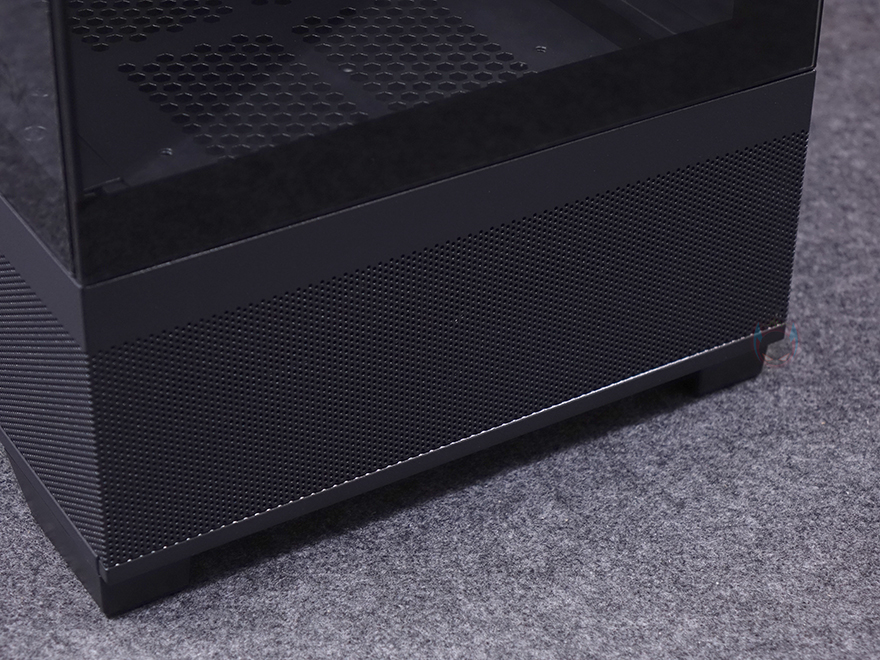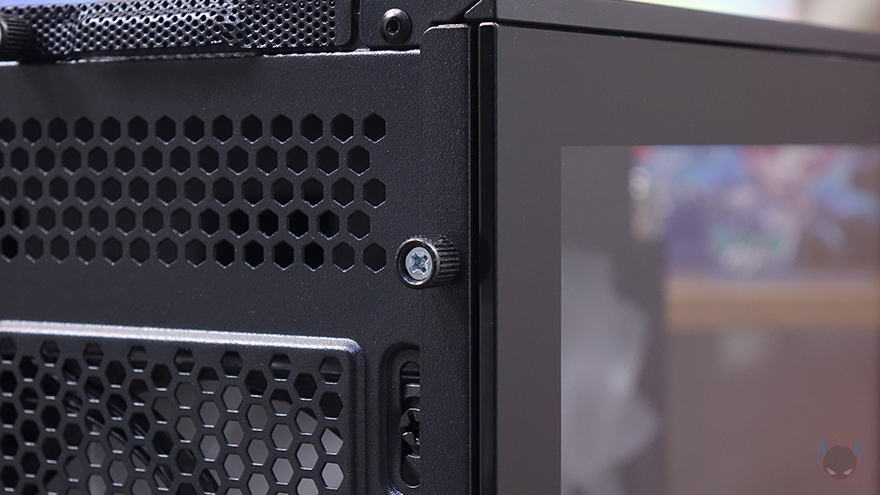 측면 사이드 패널 같은경우 먼저 오른쪽 패널은 후면 손나사를 사용해 고정/분리하는 방식이며, 내부 측면 쿨링시스템 자리에 맞춰 패널 앞부분에 벌집모양의 에어홀 처리를 해놨습니다. 패널을 분리해서 안쪽을 보면 자석방식의 먼지 필터가 기본 장착된 것을 확인할 수 있죠. 그리고, 왼쪽 패널은 어항케이스 콘셉트에 따라 전면과 마찬가지로 강화유리 패널로 고정/분리는 오른쪽 패널과 동일하게 후면 손나사를 사용했습니다. 강화유리 패널을 분리해 보면 유리 안쪽에 파손방지를 위한 보강대가 적용된 것을 확인할 수 있죠.