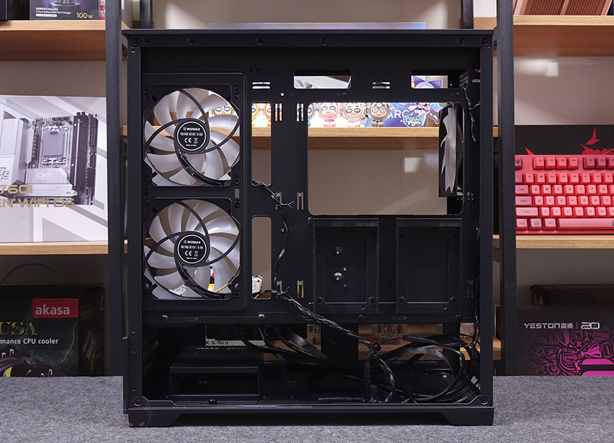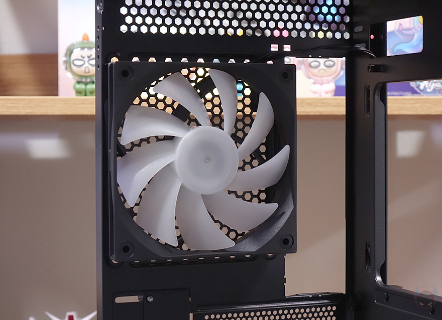 이제, 마이크로닉스 WIZMAX ML-360 View PC케이스의 내부를 살펴보는데, 어항케이스 콘셉트라 내부 구조는 단순한 편입니다. 일단, 미니타워 제품이기때문에 시작에서 언급했듯이 메인보드는 M-ATX, 미니-ITX 기반으로 장착되며, 메인보드 트레이 부분에는 큼지막한 CPU-cut-Out 홀을 중심으로 주변 케이블 정리를 위한 선정리홀이 기본 처리되어 있죠. 또한, 트레이 오른쪽에는 측면 쿨링시스템으로 120mm 팬이 2개 기본 장착된 것을 확인할 수 있는데, 외부 공기를 흡입하는 역할을 하기 때문에 리버스 팬을 장착했으며, 연결작동 방식은 3핀에 RGB 효과를 볼 수 있는 ARGB 팬입니다. 내부 하단에는 추가 쿨링시스템 시스템을 갖출 수 있게 팬 장착을 지원하는데 최대 120mm 팬 3개를 장착할 수 있죠. 후면 배기역할의 120mm 팬 역시 측면과 동일한 3핀 작동방식에 ARGB 팬이며, 아래 PCI 슬롯은 모두 일회용으로 적용되었습니다.