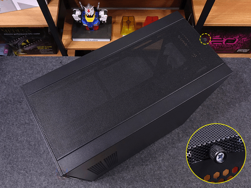 WIZMAX ML-360 View PC케이스 상단 같은경우 미들타워 버전과 유사한 디자인을 가졌지만, 중앙을 중심으로 적용된 메쉬 디자인 부분만 패널 역할로 분리가 되며, 후면 고정된 손나사를 풀면 쉽게 분리할 수 있고, 구멍이 촘촘하기 때문에 따로 먼지 필터는 적용되어 있지 않습니다. 또한, 패널을 분리하면 내부 상단에 쿨링시스템을 갖출 수 있게 에어홀과 함께 나사홀 처리도 확인할 수 있는데, 팬 장착 시 140mm 최대 2개 또는 120mm 최대 3개를 장착할 수 있고, 수랭쿨러 사용 시 최대 360mm 라디에이터까지 장착할 수 있습니다.