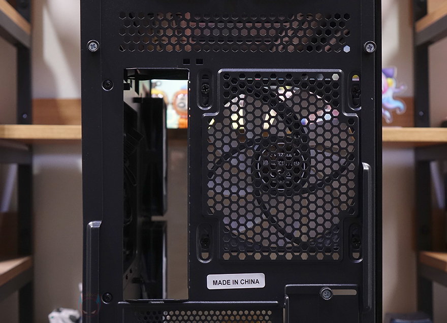케이스 후면에는 배기 역할로 벌집 모양 에어홀 처리와 함께 내부 120mm 팬이 기본 장착된 것을 확인할 수 있으며, 윗부분 그러니깐 내부 상단 공간도 어느정도 확보하고 있는 걸 확인할 수 있습니다. PCI 슬롯은 미니타워 기준인 4개보다 1개 더 많은 5개를 갖추고 있으며, 맨 아래 파워서플라이 자리에는 상하방향 모두 장착이 가능하도록 나사홀이 처리되어 있죠. 외형 끝으로, 케이스 밑바닥 부분을 살펴보면, 받침대는 약 16mm로 미끄럼방지 및 진동소음 최소화를 위해 패드도 함께 부착되어 있으며, 앞부분에는 내부 HDD베이를 좌우 이동이 가능하도록 걸쇠가 처리된 것을 확인할 수 있고, 뒷부분 파워서플라이 자리에는 분리형 먼지 필터와 함께 역시 쿨링효과를 위해 벌집 모양 에어홀이 처리되어 있습니다.