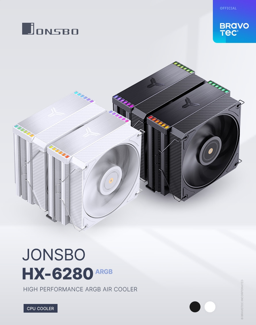 PC 케이스, 쿨링, 파워 서플라이, 입력 장치 및 외부 장치 전문 업체 ㈜브라보텍( https://bravotec.co.kr )에서 저소음 복합 FDB 베어링이 타입인 130mm/120mm 듀얼 팬 냉각 장치 구성 및 6개의 솔더링과 파이프가 뭉쳐져 있는 스프링클러링 성능을 자랑하는 JONSBO 하이엔드 타워 타워 공랭 쿨러 JONSBO HX6280 ARGB 모델을 켤 수 있습니다.