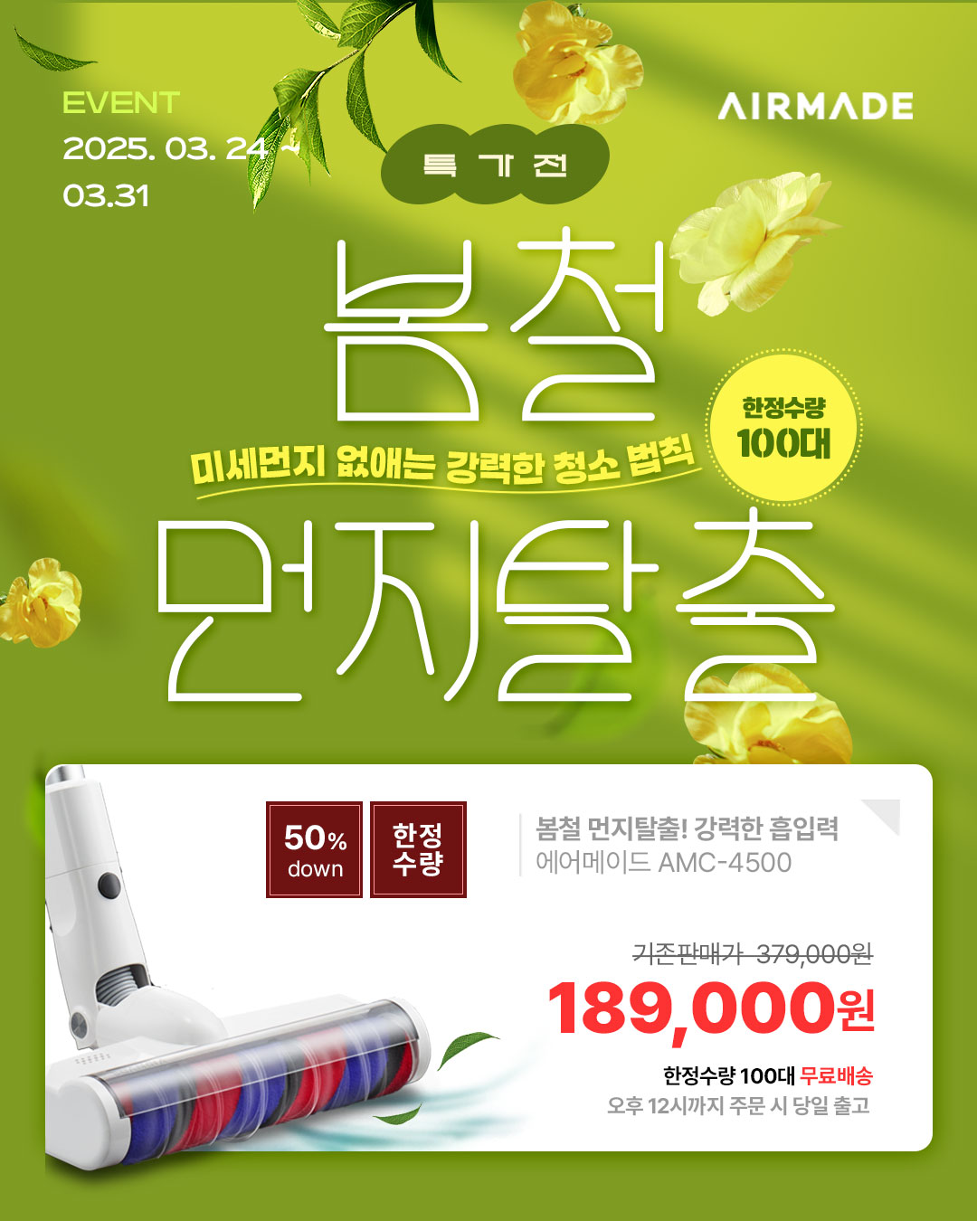 이번 행사는 에어메이드 무선청소기를 기존 판매가 379,000원에서 50% 할인된 189,000원에 구매할 수 있는 파격 혜택으로, 단 100대 한정 수량으로 진행된다. 오후 12시 이전 주문 시 당일 출고되며, 전 제품은 무료 배송으로 제공된다.