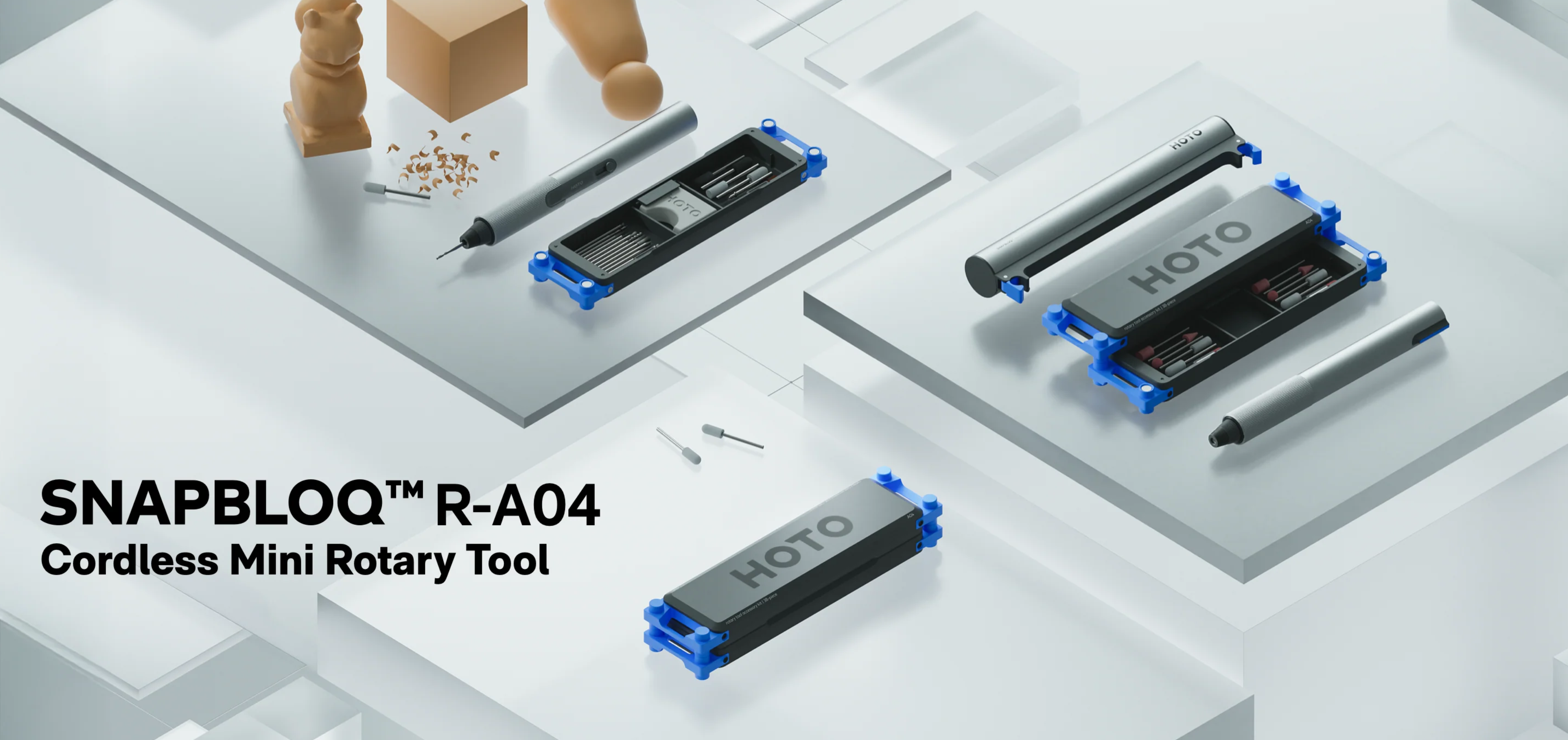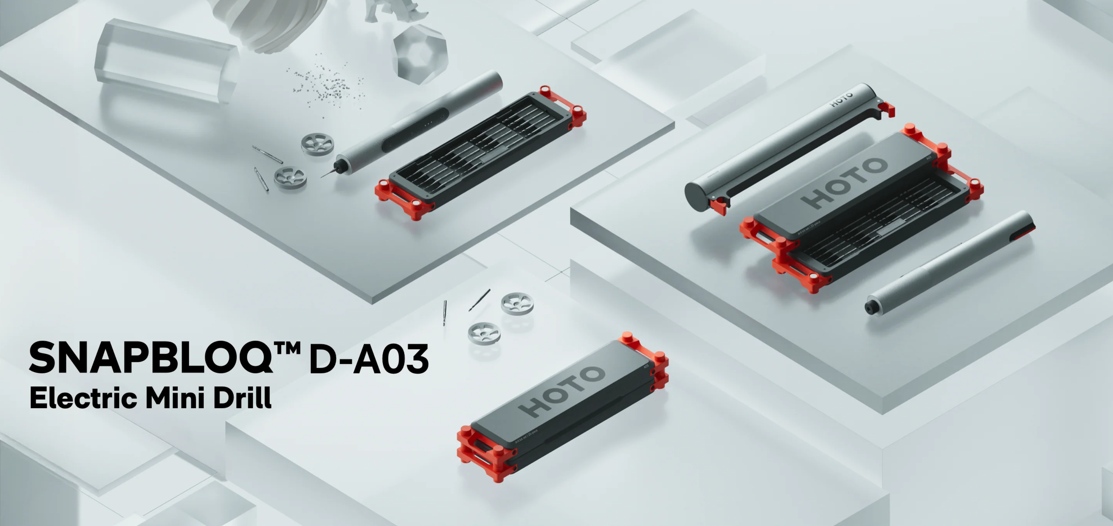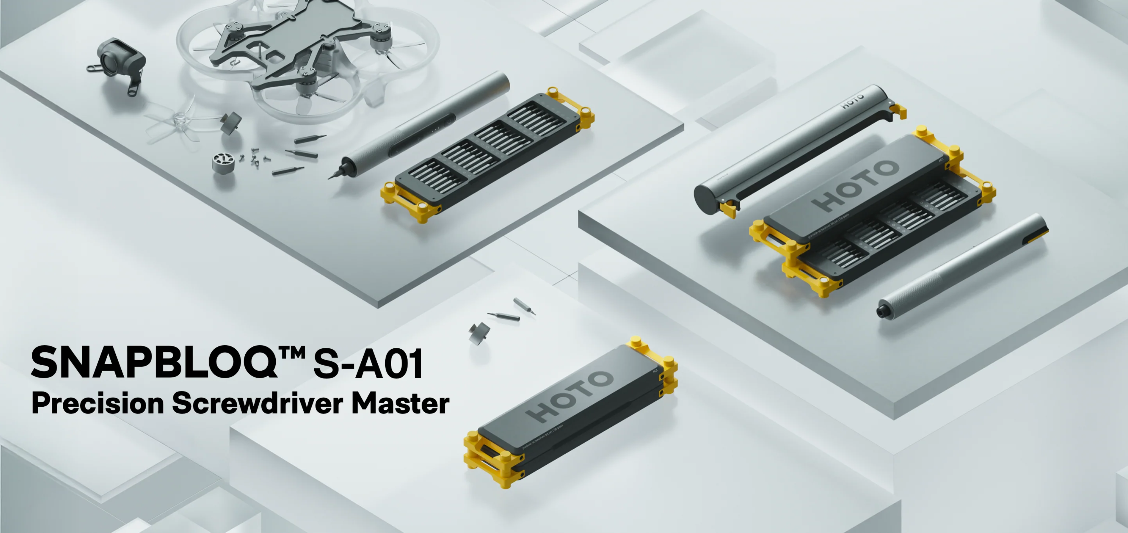 SNAPBLOQ 시리즈는 S-A01, D-A03, R-A04 3개의 키트 상품이 있는데, S-A01은 전동 스크류드라이버 키트 상품으로 소형 전자제품 분리시 유용하며, D-A03은 전동 미니 드릴 키트, R-A04는 미니 로터리 공구로 2가지 상품은 미니 공예 같은 가공 작업에 유용하다. 모든 키트 상품은 충전식 전동 방식에 상품별로 비트를 교체해서 사용한다. 출시가는 129달러이며, 현재 호토 공식 홈페이지에서 출시기념 20% 할인으로 99.99달러에 판매 시작되었다.