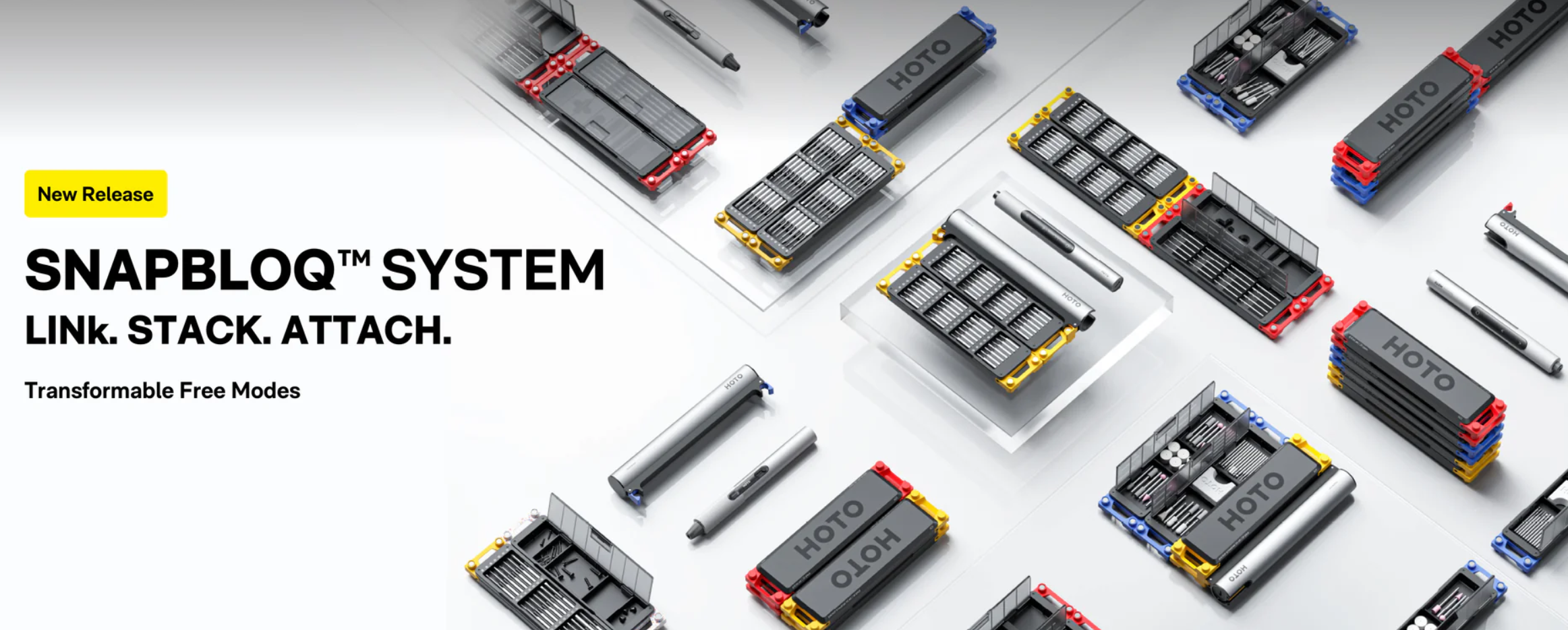 국내 소비자들에게는 일명 샤오미 공구 브랜드로 잘 알려진 호토(HOTO, https://hototools.com/)에서 한국시간으로 3월 24일에 신제품을 출시했다. 제품명은 SNAPBLOQ 시리즈(series)로, 이미 IF 디자인 어워드 2025를 수상한 제품이기도하다. SNAPBLOQ 시리즈는 총 3가지 타입의 무선 전동 공구 키트를 블록처럼 쌓아 확장, 보관할 수 있는 모듈러 디자인을 적용한것이 특징이다.