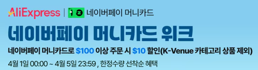 국내 소비자들이 많이 이용하고, 국내 이커머스 시장 2위 점유를 하고 있는 글로벌 쇼핑 플랫폼 알리익스프레스의 4월 초이스데이 행사가 4월 1일부터 5일까지 진행된다. 이번 초이스데이는 3월 초이스데이와 동일한 기간으로 진행되며, 결제할인 역시 네이버페이 머니카드로 동일하다. 100달러이상 구매시 10달러 할인을 받을 수 있다. 그리고, 할인코드 역시 7개의 가격별로 이번에도 제공된다. 할인코드는 아래를 참고하면 된다.