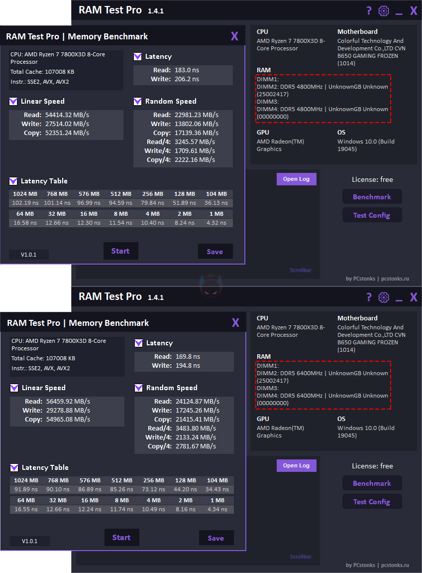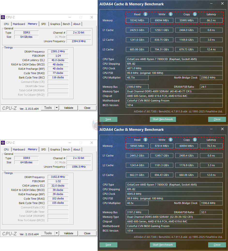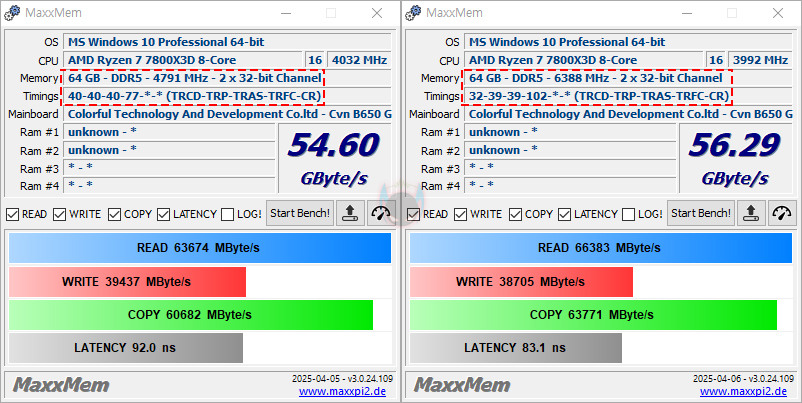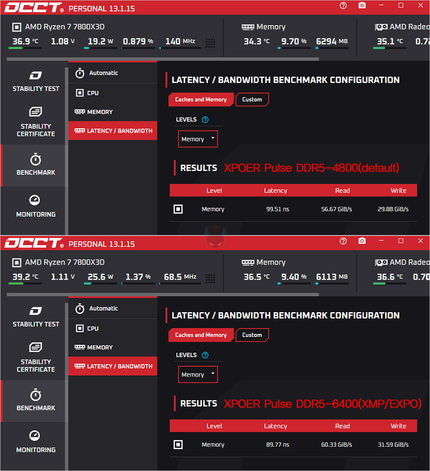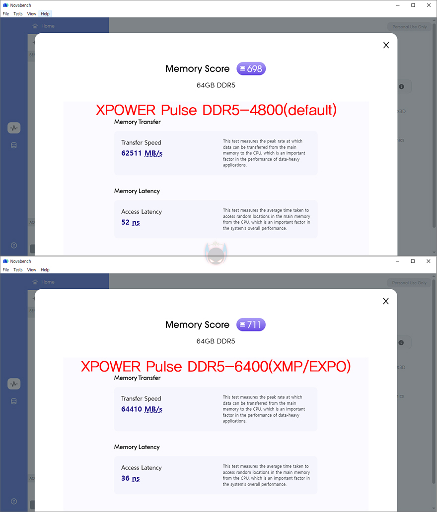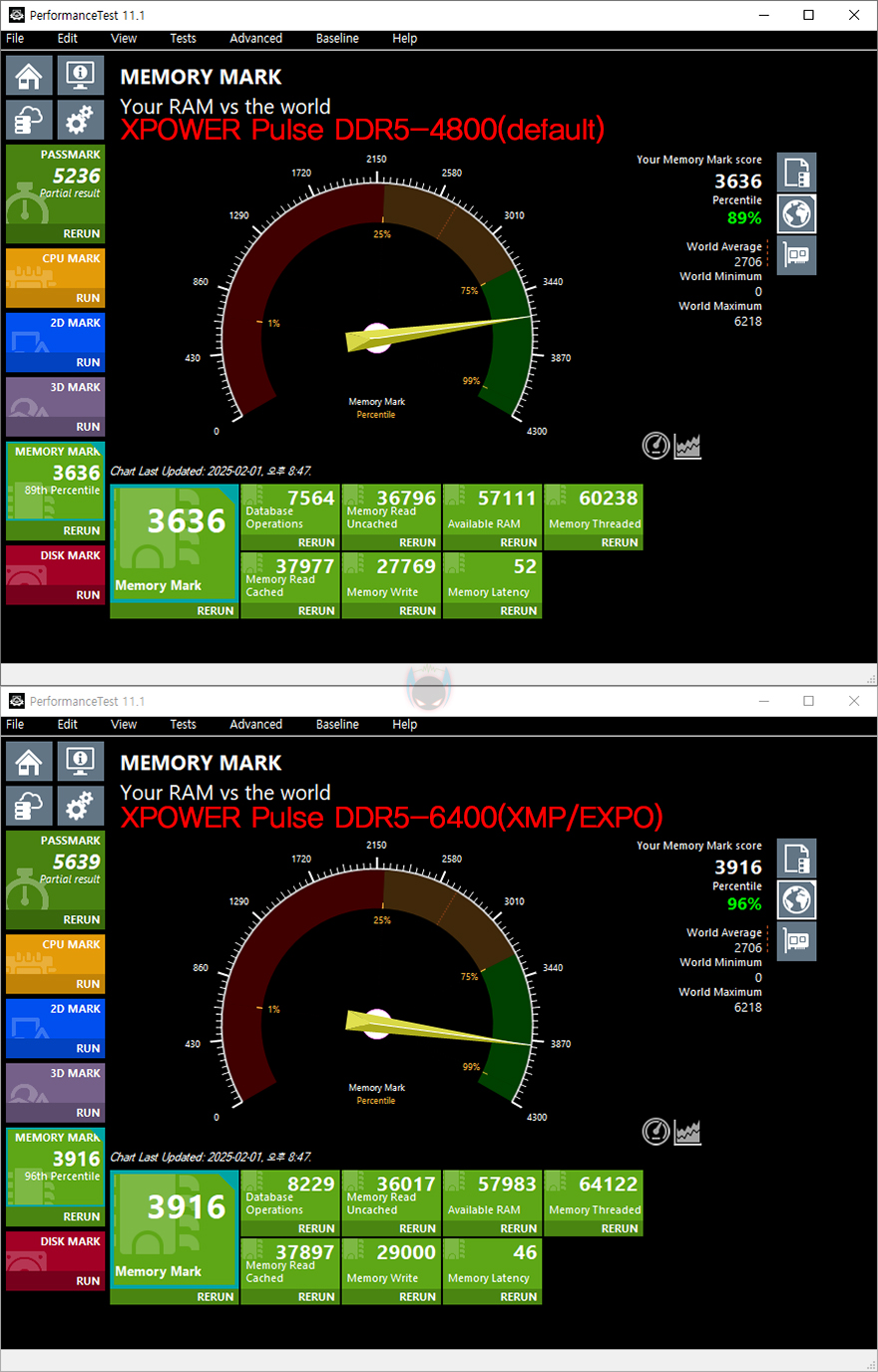 그럼, 기본 작동 클럭(4800 MHz)일때와 XMP/EXPO를 적용한 6400MHz 클럭일때의 성능을 비교해보면, AIDA64의 Cache&Memory Benchmark에선 읽기, 쓰기, 복사 대역폭이 늘어난 것을 확인할 수 있으며, 레이턴시 역시 더 빨라진것을 확인할 수 있습니다. MaxxMEM에선 읽기와 복사, 레이턴시에서 두드러지게 향상되었고, Novabench Memory Test 역시 대역폭과 레이턴시(Latency) 모두 빨라진 것을 확인할 수 있죠. 이밖에 OCCT의 Memory 레이턴시와 대역폭, RAM Test Pro의 벤치마크에서도 역시 4800MHz 클럭보다 6400 MHz에서 성능향상이 이루어진 것을 확인할 수 있습니다. 그리고, Passmark PerformanceTest-Memory Mark에서도 클럭이 높아지면서 더 높은 점수를 획득하는 걸 확인할 수 있습니다.