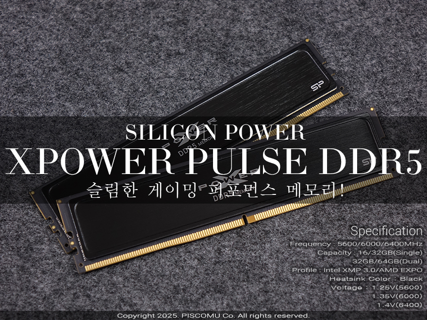 인텔(Intel)/AMD 모두 이제 차세대 CPU를 통해 완전히 메모리(RAM) 지원은 DDR5로 넘어왔죠. 그래서, 현재 데스트탑 기반의 조립 PC를 맞추게 되면 메모리는 DDR5를 선택하게 됩니다. 국내 메모리시장과 저장장치 시장에서 활동하고 있는 대만의 대표적인 메모리&스토리지 전문업체 실리콘파워(Silicon Power, http://www.silicon-power.com) 역시 이미 DDR5 메모리 제품군을 꽤 갖추고 있으며, 대부분 실리콘파워의 게이밍(Gaming) 브랜드 XPOWER에 속해있죠. 앞서 XPOWER의 DDR5 메모리로 Zenith(https://piscomu.com/314925)과 Storm(https://piscomu.com/314927) 모델을 만나봤는데, Zenith는 이미 DDR4 라인업에서도 있었던 모델이었고, Storm은 DDR5 라인업에서 새롭게 추가된 모델이었습니다. 그리고, 오늘 만나볼 XPOWER의 또다른 DDR5 역시 DDR4에서부터 존재했던 모델이고 가장 심플하고 슬림했던 모델이죠. 바로, XPOWER Pulse입니다. 그럼, DDR5까지도 이어진 실리콘파워의 XPOWER Pulse DDR5 메모리를 한 번 만나보도록 하죠.