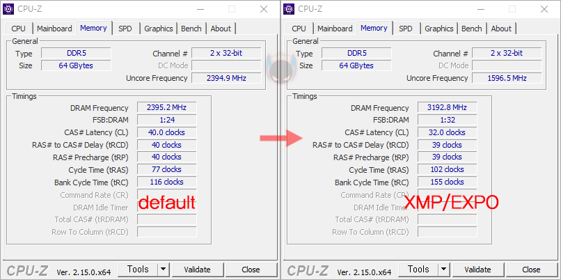 그리고, CPU-Z를 통해 리뷰에 사용된 XPOWER Pulse DDR5-6400 모델의 정보 및 작동클럭을 확인해 보면, 기본 작동클럭은 4800 MHz이며, 6400 MHz 클럭은 인텔 XMP와 AMD EXPO 프로파일로 적용되었다라는 걸 확인할 수 있죠. 그래서, 사용하는 메인보드에서 XMP나 EXPO 프로파일값을 불러오면, 손쉽게 6400 MHz으로 오버클럭 작동되는 걸 확인할 수 있습니다.