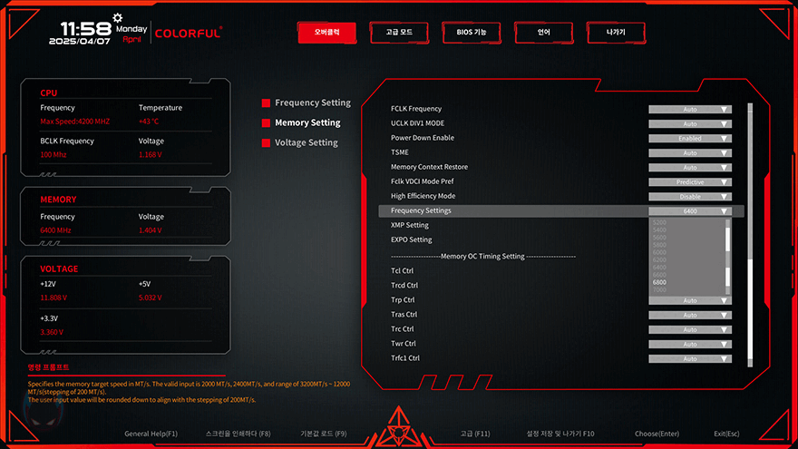 방금 확인했듯이 XPOWER Pulse DDR5-6400 모델은 XMP/EXPO 프로파일을 통해 클럭이 올라가면서 성능이 향상된 걸 확인할 수 있는데, 앞서 메모리 모듈과 CPU-Z에서 언급 확인했듯 XPOWER Pulse DDR5에는 SK하이닉스 메모리가 사용되었습니다. 현재 DDR5 메모리에 대부분 SK하이닉스가 사용되는 이유는 HBM기술로 높은 클럭 수율을 자랑하기 때문입니다. 물론, 메모리 다이(Die)에 따라 차이가 있어서 이 조건이 모두 적용되는 건 아닙니다. 그래서, XPOWER Pulse DDR5 메모리를 추가로 수동오버클럭을 시도해 봤는데, 확인결과 XMP/EXPO 프로파일의 전압과 동일한 1.4V 기준에서 최대 6800 MHz까지 오버클럭되는 걸 확인할 수 있었습니다. 다만, 타이밍값도 늘어나기 때문에 사실상 성능차이는 오히려 낮아져 XPOWER Pulse DDR5는 XMP/EXPO의 프로파일값을 사용하는 가장 최적의 성능을 발휘한다 할 수 있겠습니다.