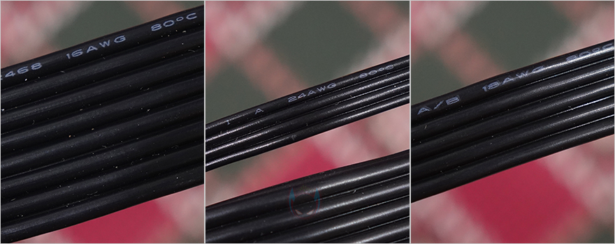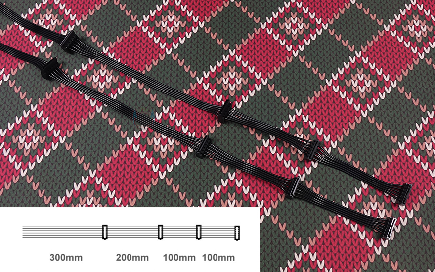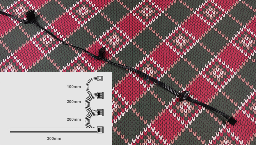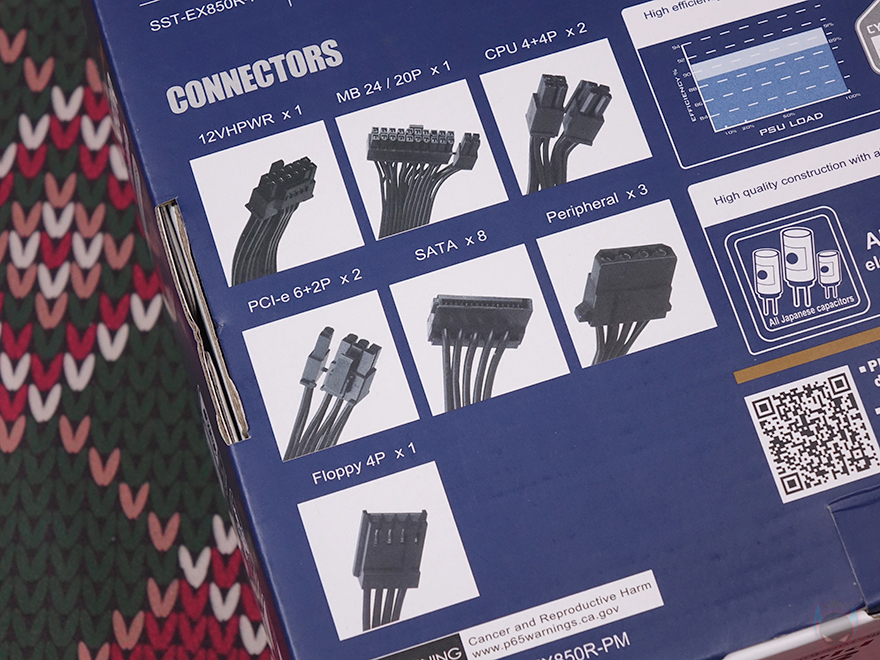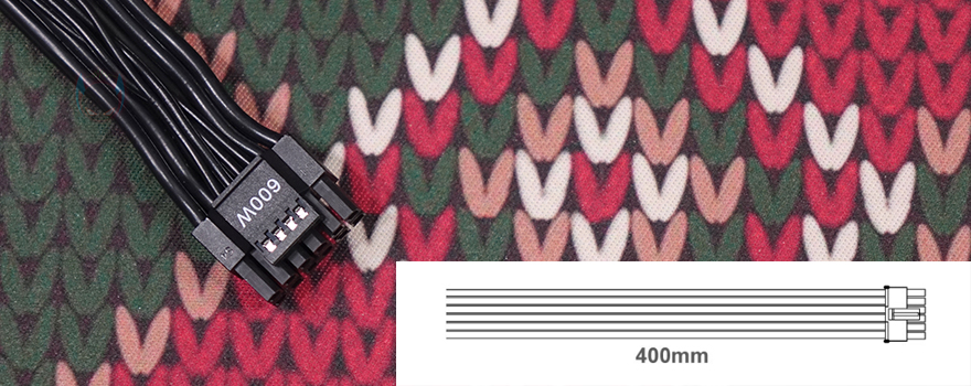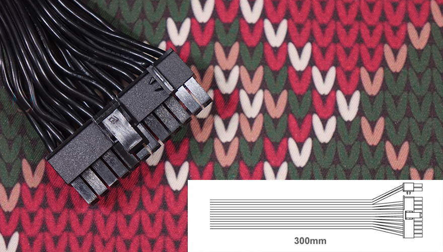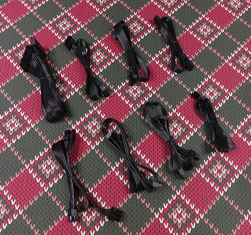 이번에는 모듈식 케이블들을 살펴보는데, 메인보드 24핀 케이블까지 모듈식인 풀-모듈러(Full modular) 구성이며, 케이블은 총 8개입니다. 케이블 타입은 모두 플랫(Flat) 타입이며, 전선 굵기는 메인보드 24핀 케이블과 CPU 보조전원, PCIe 8핀 케이블들은 16 AWG, 12VHPWR(12V-2x6) 케이블은 16AWG+24AWG, SATA와 PATA 케이블은 18AWG 규격을 사용했습니다. 커넥터 지원은 메인보드 24핀을 비롯해, CPU 8(4+4)핀 2개, 12VHPWR(12V-2x6) 1개, PCIe 8(6+2) 핀 2개, SATA 커넥터 8개, PATA 커넥터 3개, FDD 커넥터 1개를 구성하고 있습니다. 각 케이블 길이는 SFX 파워서플라이 주로 사용되는 미니타워/ITX PC케이스에 맞춰서 넉넉한 길이로 적용되었죠.