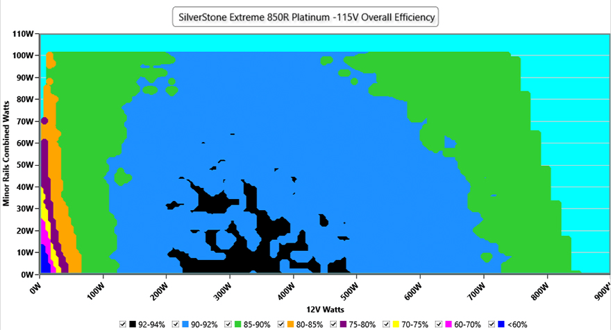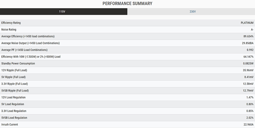 끝으로, Extreme 850R Platinum 파워서플라이는 앞서 언급하고 미리 확인했듯이 80 Plus 효율등급보다 까다로운 사이버네틱스(Cybenetics)의 플래티넘 효율등급을 받았습니다. 실제 사이버네틱스에 등록된 Extreme 850R Platinum 파워서플라이의 테스트 결과를 보면, 115V와 230V 전압 규격에서 평균 89~91% 효율을 보여줬는데, 220V를 사용하는 한국에서 230V 효율이 좀 더 좋은 것을 확인할 수 있고, 팬 소음 역시 30dB 이하의 A- 등급을 받은 것을 확인할 수 있습니다. 특히, 230V에서는 200W~850W 사용량까지 효율이 115V에서 사용하는 것보다 더 좋은 걸 확인할 수 있어서, 국내 소비자들에게 좀 더 매리트 있게 다가올 수 있죠.