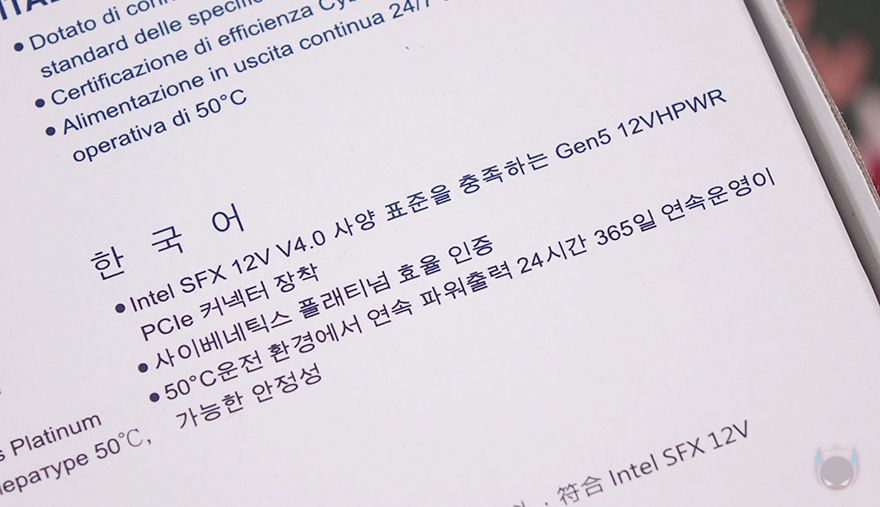 제품박스부터 살펴보면, 전면에는 모델명과 함께 제품 이미지를 담고 있으며, 아래에 용량 표기와 함께 Nvidia RTX 5070 모델부터 적용되는 12VHPWR(12V-2x6) 커넥터 지원 표기, 그리고 80 Plus보다 효율등급 받기가 까다로운 사이버네틱스(Cybenetic)의 플래티넘(Platinum) 등급 표기를 확인할 수 있습니다. 그래서, 모델명에 용량과 플래티넘 표기가 무엇을 의미하는지 쉽게 알 수 있죠. 박스 측면에는 방금 언급한 내용 외에 추가 제품 특징들 언급도 확인할 수 있는데, 인텔 ATX 3.0 지원, SFX 규격, 풀-모듈러, 일본산 캐패시터, 최신 CPU, FDB 팬, 플랫 케이블을 언급해 놨습니다. 또 다른 측면에는 한국어를 포함해 다국적으로도 간략하게 일부 특징을 표기해 놨죠.