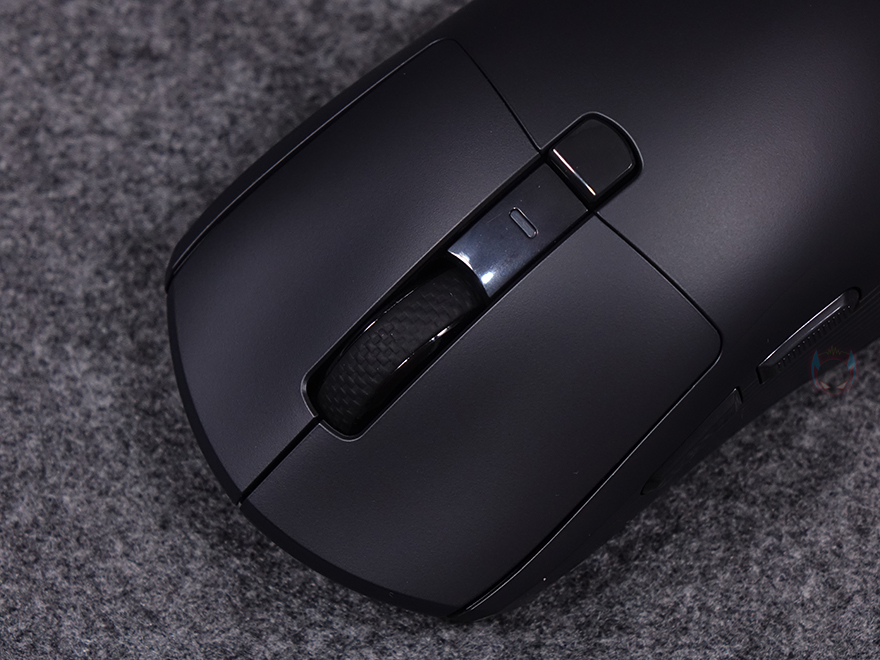 위치별로 좀 더 자세히 살펴보면, 앞쪽 그러니깐 그립시 손가락이 올라가는 기본 좌우 버튼은 약간 홈이 들어간 인체공학적 디자인과 함께 좌우 클릭 커버 영역이 분리 설계되어 있습니다. 그래서, 그립과 상관없이 버튼 클릭이 잘 유도되고 정확하죠. 가운데에 휠-버튼 같은경우 스크롤 접지력을 위해 고무재질을 사용했으며, 표면에 격자패턴의 엠보싱 디자인을 적용하고 있습니다. 그리고, 뒤로는 DPI 단계와 배터리 잔량을 확인할 수 있는 LED 인디케이터가 적용되어 있죠. 그립시 뒤쪽 손바닥 부분에는 심플하게 유그린 로고를 새겨놨으며, 좌우 측면에는 동일하게 스트라이프 디자인과 동시에 맨 아래 일부분 RGB 라이트닝 효과를 볼 수 있게 디자인이 적용되어 있죠. 그리고, 왼쪽 측면에는 추가 버튼 2개가 배치되어 있는데, 기본 기능은 페이지 앞/뒤입니다.