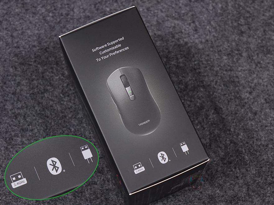 직접, 유그린 G908 게이밍 마우스를 사용해보면, 일단 연결방식은 앞서 언급했듯이 유선, 무선 2.4G, 블루투스 3가지 모두 지원합니다. 유선은 제공되는 전원 및 충전 USB 케이블을 사용하면 별도의 드라이버 설치 없이 바로 인식 사용되며 유선 연결 시 DPI 버튼 앞부분에 배치된 LED 인디케이터가 레드색상으로 표시해 줍니다. 무선 2.4G 역시 수납된 리시버 수신기를 PC/노트북에 꽂은 후 마우스 밑바닥에 있는 전원 On/Off 스위치를 On으로 켜고, 연결모드 버튼을 눌러서 무선 2.4G 모드를 선택하면 자동으로 연결되고 이때 LED 인디케이터는 그린 색상으로 표시됩니다. 마지막으로 블루투스 연결은 무선 2.4G와 동일하며, 모드 연결에서 블루투스 모드를 선택하면 LED 색상이 블루색상으로 표시되며 이때 연결할 기기에서 G908 기기를 찾아 인식하면 선택해서 연결 사용하면 됩니다. 참고로, 블루투스로 연결하면 운영체제에서 장치 인식과 함께 배터리 잔량을 확인할 수 있습니다.