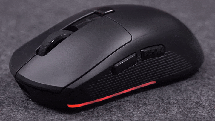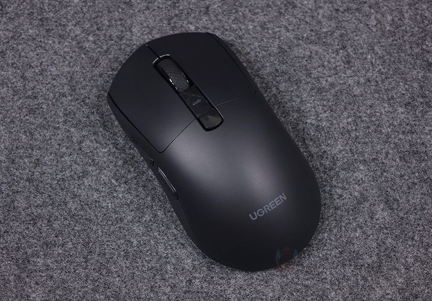 그럼, 본격적으로 유그린 G908 게이밍 마우스를 살펴보는데, 색상은 블랙 1가지로만 출시되었고, 무게는 뒤에서 확인하겠지만 무선 2.4G 사용 시 이용되는 리시버가 마우스에 기본 수납된 상태라 리시버까지 수납된 상태의 무게로 약 65g을 가졌습니다. 요즘 게이밍 마우스의 특징인 초경량 무게는 그대로 반영하는 거죠. 그리고, 마우스 디자인은 좌우 대칭이며, 측면에서 다시 확인하겠지만 왼쪽 측면에 추가 버튼이 있기 때문에 오른손잡이 마우스입니다.