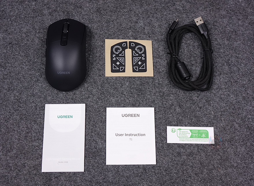 유그린 G908 게이밍 마우스 내부를 잠깐 살펴보면, 상판 커버 안쪽 기본 좌우버튼 뎀버는 ㅁ자 형태로 그립에 상관없이 정확한 클릭이 유도되도록 했으며, 기본 좌우버튼, 휠버튼, DPI 버튼, 측면버튼 스위치 모두 카일(Kailh)사 제품을 사용했습니다. 특히, 기본 좌우 버튼스위치는 카일 GM8 스위치로 8천만 회 클릭 수명을 가지고 있죠. 여기에 센서는 현재 무선 게이밍 마우스에서 가장 많이 사용되는 PixArt사의 PAW3395 칩을 탑재했습니다. 또한, MCU 칩은 무선 2.4G에서 4KHz 전송제어속도를 지원하는 HiSilicon사 칩을 탑재했죠. 참고로 유선에서 최대 8KHz를 지원합니다. 전체적으로 내구성 역시 요즘 무선 게이밍 마우스 트렌드를 고스란히 담아서 나왔습니다. 끝으로, 기본 제공되는 전원 및 충전 USB 케이블은 총 1.8m 길이에 전체 패브릭 슬리빙처리를 했으며, USB Type-A to C 인터페이스를 가졌으며, 신호손실 최소화를 위해 노이즈필터도 적용되어 있습니다.