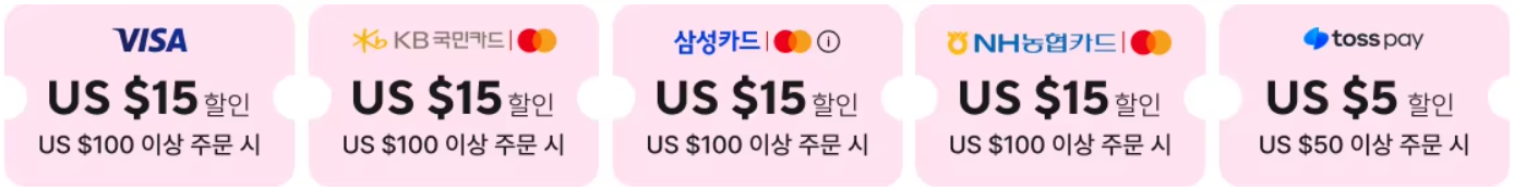 4월 블라썸 세일 프로모션 할인 혜택을 확인해보면, 먼저 결제할인은 총 5개로 비자, KB/삼성/농협 마스터 카드는 100달러이상 구매시 15달러 할인을 받을 수 있는데, 해외 직구 상품 한해서 적용된다. 그리고, 50달러이상 구매시는 토스페이로 결제할경우 5달러 할인을 받을 수 있는데, 국내외 상품 모두 적용된다. 또한, 이번 달에도 총 6개의 가격대별 할인코드가 나왔기때문에 구입가격대에 맞춰서 할인코드를 적절하게 사용하는게 중요하겠다. 할인코드는 아래는 참고하면 된다.