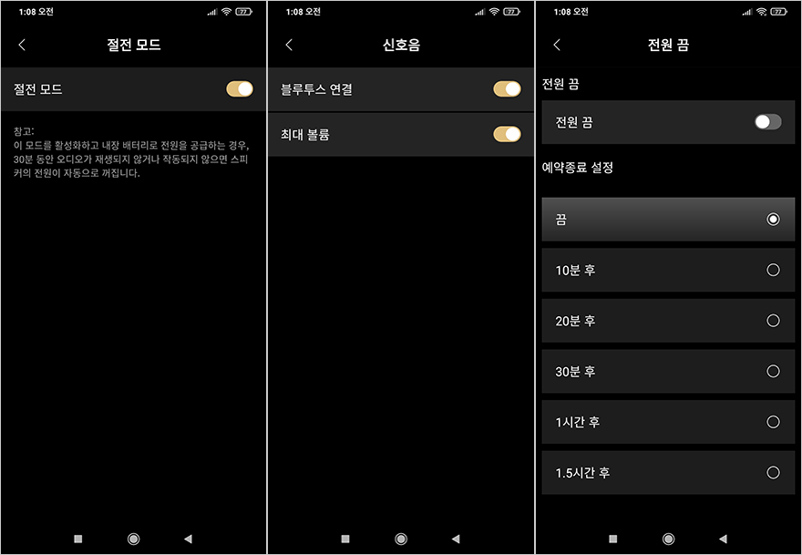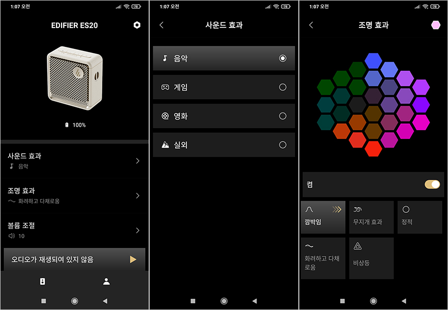 ES20 포터블 블루투스 스피커 역시 에디파이어의 공용 앱 ConneX를 지원합니다. 블루투스 연결을 마치면 ConneX에서 장치 인식과 함께 메인화면에서 이미지와 배터리 잔량을 확인할 수 있으며, 기본 메뉴로 사운드효과, 조명효과, 볼륨조절을 확인할 수 있는데, 사운드효과는 음악/게임/영화/실외 4가지 모드를 지원하며, 조명효과는 방금 버튼으로 언급했던 5가지 모드를 확인할 수 있죠. 물론, 앱에서는 조명 모드에 따라 색상변경이나 밝기조절을 추가로 설정할 수 있습니다. 그리고, 볼륨조절은 16단계로 조절이 가능하며, 제품 이미지 오른쪽 위에 있는 마름모 아이콘의 '나의 디바이스' 메뉴로 들어가면 추가 메뉴들을 확인할 수 있는데, 절전 모드나 신호음 설정, 예약 시간 설정으로 전원 끄기를 할 수 있습니다.