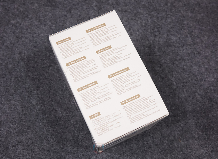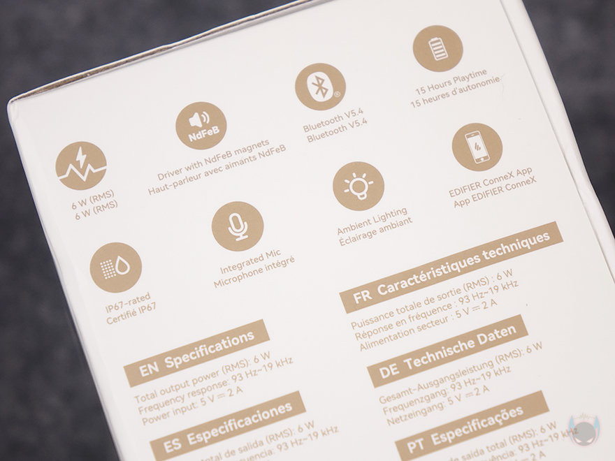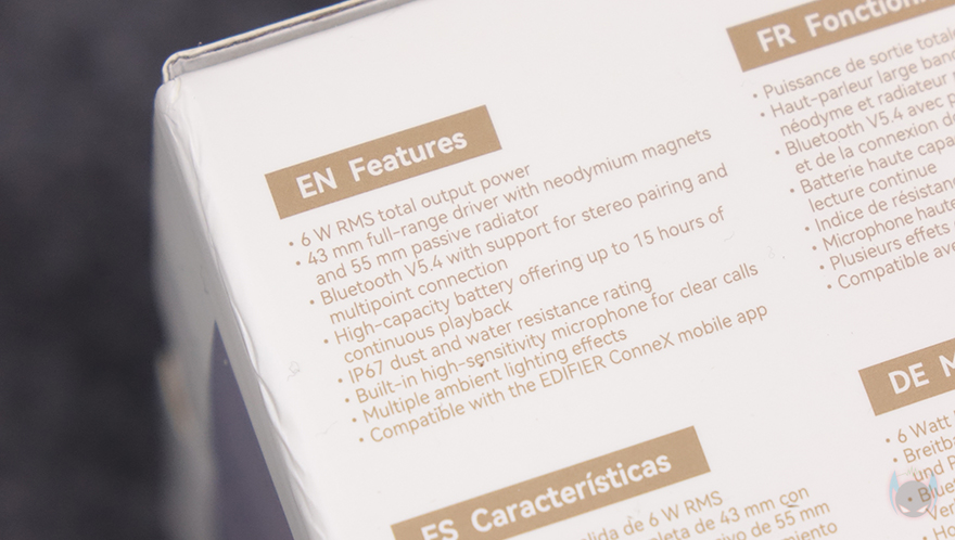 제품 패키지는 박스형태로 앞서 먼저 만난 ES60과 마찬가지로 박스전체 밀봉처리가 되어있습니다. 그리고, 시작에서 언급했듯이 ES시리즈에서 가장 작은 크기를 가져서 박스 사이즈도 한눈에 봐도 작다라는걸 알 수 있죠. 박스 전면에는 제품 이미지를 담고 있어서 개봉 전에 미리 디자인을 확인할 수 있고, 모델명만 간략하게 표기해 놨습니다. 박스 한쪽 측면에는 주요 특징과 기본 사양을 표기해 놨는데, 주요 특징에는 6W 사운드출력, 네오디뮴 자석(NeFeB) 드라이버 유닛, 블루투스 5.4 버전, 최대 15시간 재생, IP67 방수방진 등급, 내장 MEMS 마이크, 주변 조명 효과, 공용 앱 ConneX 지원을 언급하고 있습니다. 아래에는 다국적 언어로 출력과 주파수대역, 소비전력을 기본사양으로 표기해 놨죠. 박스 후면에는 방금 언급했던 주요 특징을 다국적 언어로 한 번 더 표기해 놨습니다.