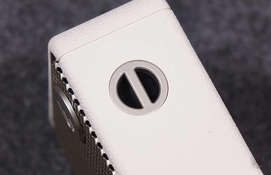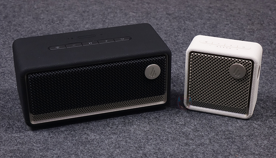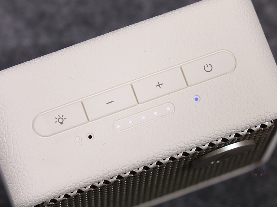 좀 더 자세히 살펴보면, 전면 그릴 부분은 메탈 소재이며, 아이보리 색상 모델 같은 경우 그릴 색상을 로즈골드 같은 색상으로 적용했습니다. 그리고, 내부에는 전면에 네오디뮴 자석 방식의 Φ43mm 풀레인지 유닛이 적용되어 있으면, 스피커 후면에는 Φ55mm의 패시브 베이스 라디에이터가 적용되어 있습니다. ES60에서도 언급했지만, 이렇게 앞뒤로 유닛이 적용되면 어느 방향에서 사운드를 들어도 좀 더 사운드 공감을 얻는 효과가 있죠. 스피커 상단에는 맨 오른쪽에 전원버튼을 시작으로 옆으로 볼륨조절과 이전/다음 곡 겸용의 -/+ 버튼, 맨 왼쪽에 조명 모드 버튼이 배치되어 있습니다. 그리고, 버튼 앞에는 전원 및 블루투스 연결상태를 확인할 수 있는 LED 인디케이터와 배터리 잔량 및 충전상태를 확인할 수 있는 LED 인디케이터, 내장 MEMS 마이크가 배치되어 있죠.